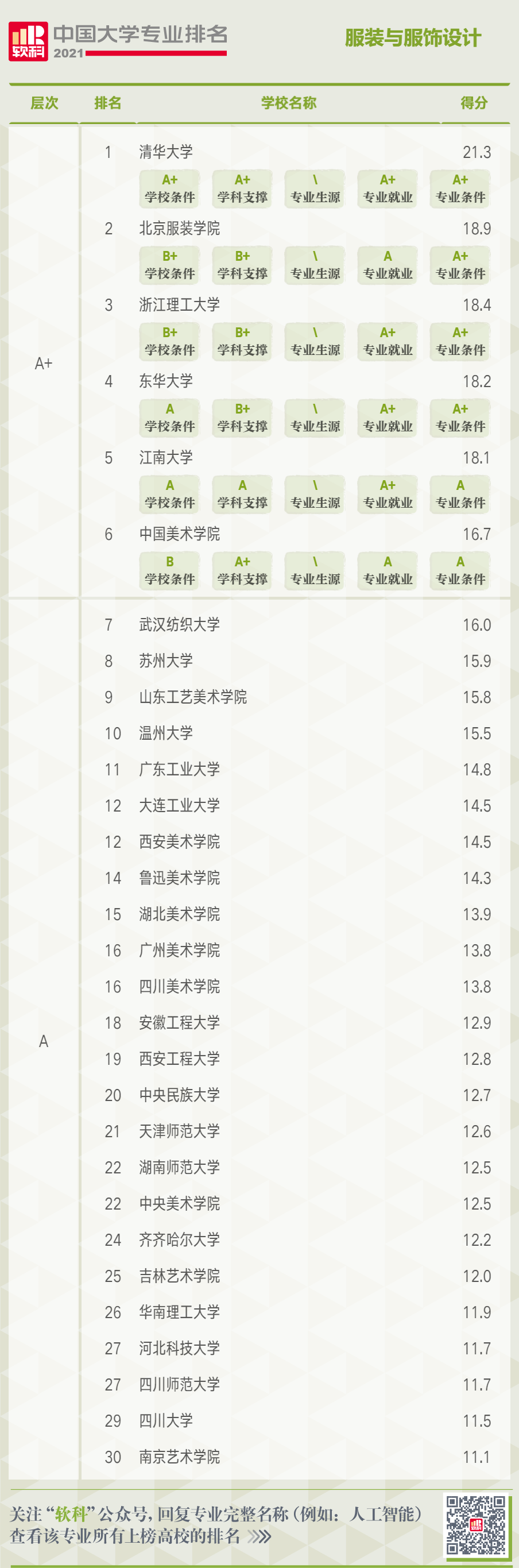 2021年6月22日,高等教育评价专业机构软科正式发布2021“软科中国大学专业排名”。每个专业榜单发布的是开设该专业并排名位列前50%的高校,服装与服饰设计专业共有150所高校上榜,我校服装与服饰设计专业位列第18位。