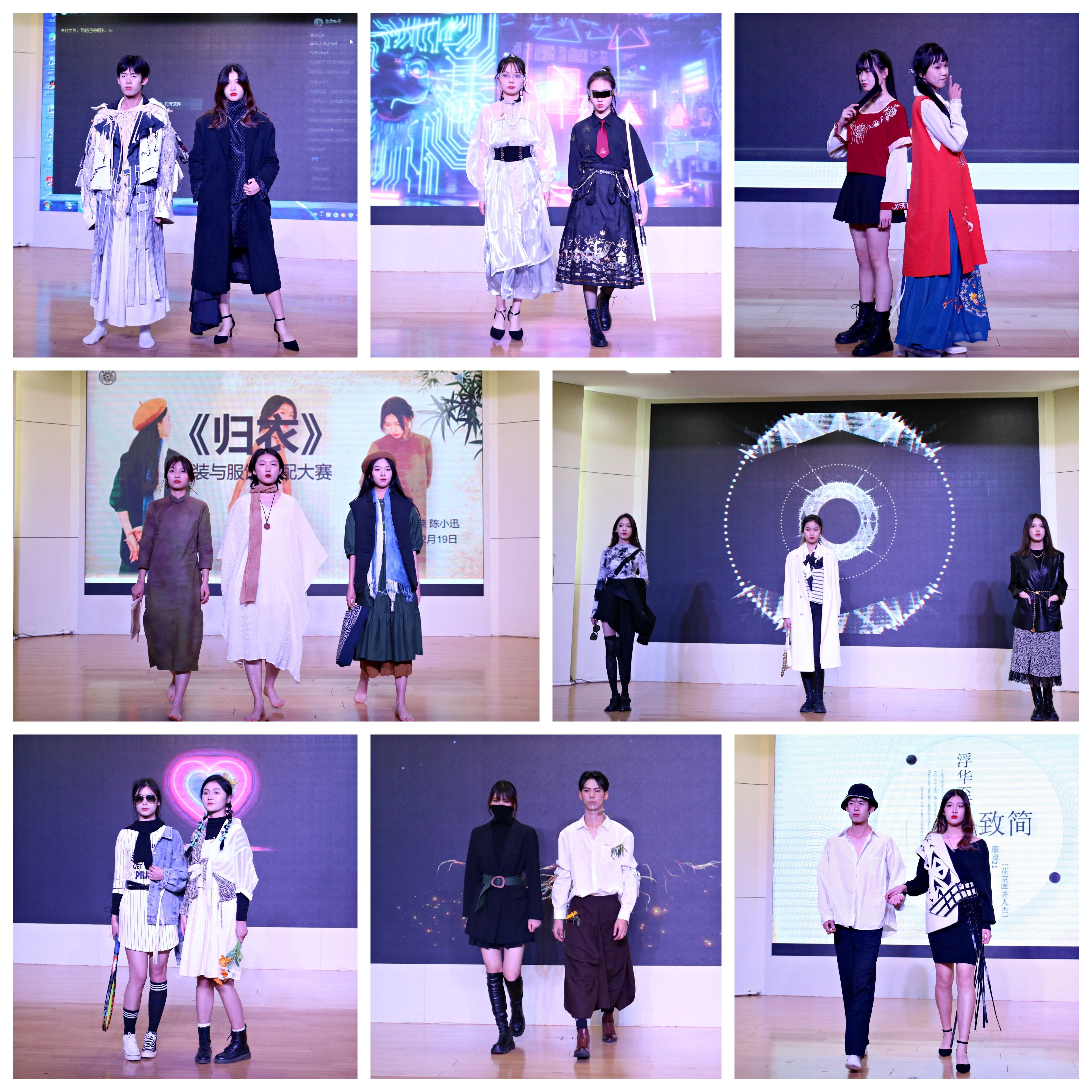 本次比赛吸引了来自全校三百多位同学积极参与,经历了初赛、复赛的激烈角逐,最终10位同学的作品脱颖而出进入决赛。选手们通过自己日常生活中的服装进行设计搭配,展现新时代青年的潮流与时尚。《归衣》在传统配色的基础上,大胆配色、进行叠穿,倡导“人”才是衣服的本身,追求更好的舒度和自然感,回归本质,返璞归真。《衣装》中紧身衣搭配机能短裙、皮衣搭配斑马纹半身裙的造型均呈现整体机能风的元素,利用安全带扣、腰链等配饰增加干练帅气的风格,给整套造型增加又酷又温柔的和谐感。邬红芳老师对此次比赛进行点评。她表示,选手们都展现了各自对服装的理解、对美的定义和对生活的认知。从无性别穿搭,到人与自然和谐共处的穿搭,再到弘扬中国风、彰显青春活力的穿搭,每种穿搭都具有独特魅力,充分展现了当代大学生丰富的精神世界和较高的美育鉴赏水平。选手们纷纷表示,在创作过程中,自己重新认识了不同服饰传递的文化象征,也更加了解了服装对于生活的意义。
