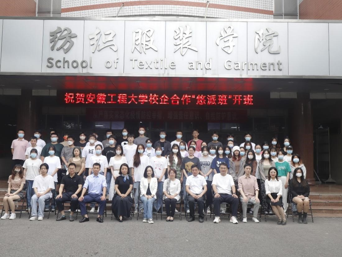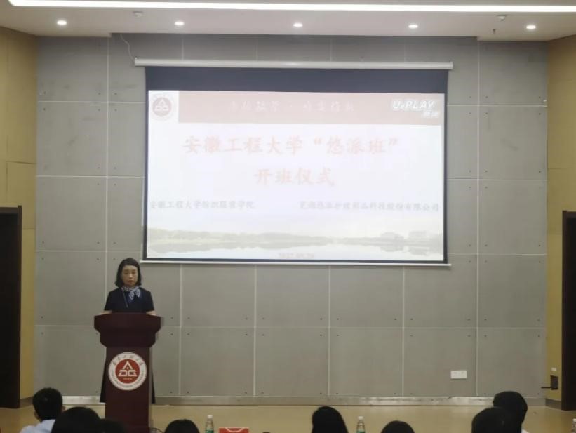 纺织服装学院副院长袁惠芬教授代表校方致辞,袁副院长指出“悠派班”的开设是校企合作人才培养模式的一种探索,能够充分发挥学校和企业的各自优势,准确把握企业用人需求,有利于学校培养符合芜湖地方经济建设的创新型高素质人才,有利于学生体验产业创新环境,提高实践能力。