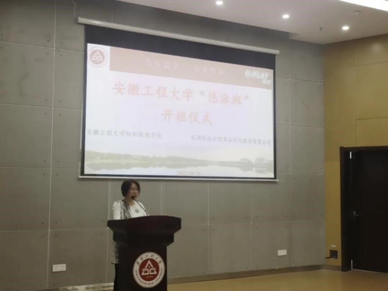 芜湖悠派护理用品科技有限公司副总经理谢吉首先发表致辞,谢副总经理表示企业的发展需要充足的人力资源作为支撑,需要不断引入新的人才以增强企业的活力,企业会尽最大力量提供人才发展的空间和资源,期待公司与学校的长期合作,祝愿同学们能在“悠派班”中获得个人能力的提升。