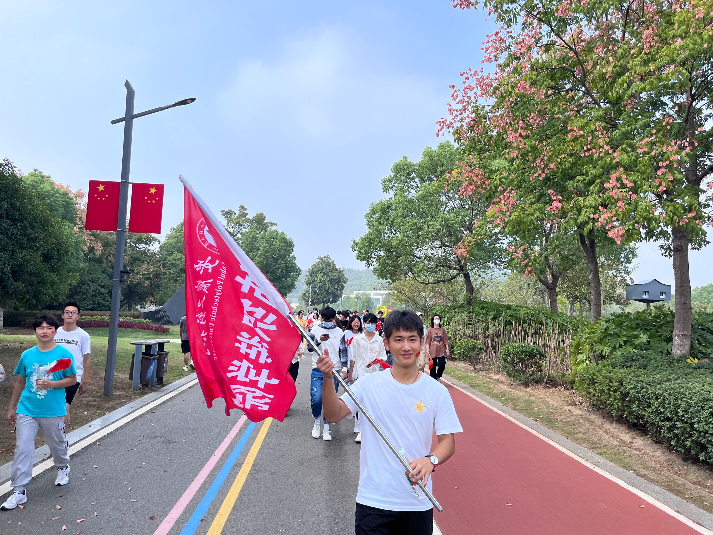 为积极落实学校“三全六专”工作要求,引导学生“壮”起来增强身体素质,以激昂的状态欢度祖国母亲的生日,以饱满的热情迎接党的二十大胜利召开,10月1日上午,纺织服装学院在雕塑公园举行团学组织学生代表五公里徒步活动。