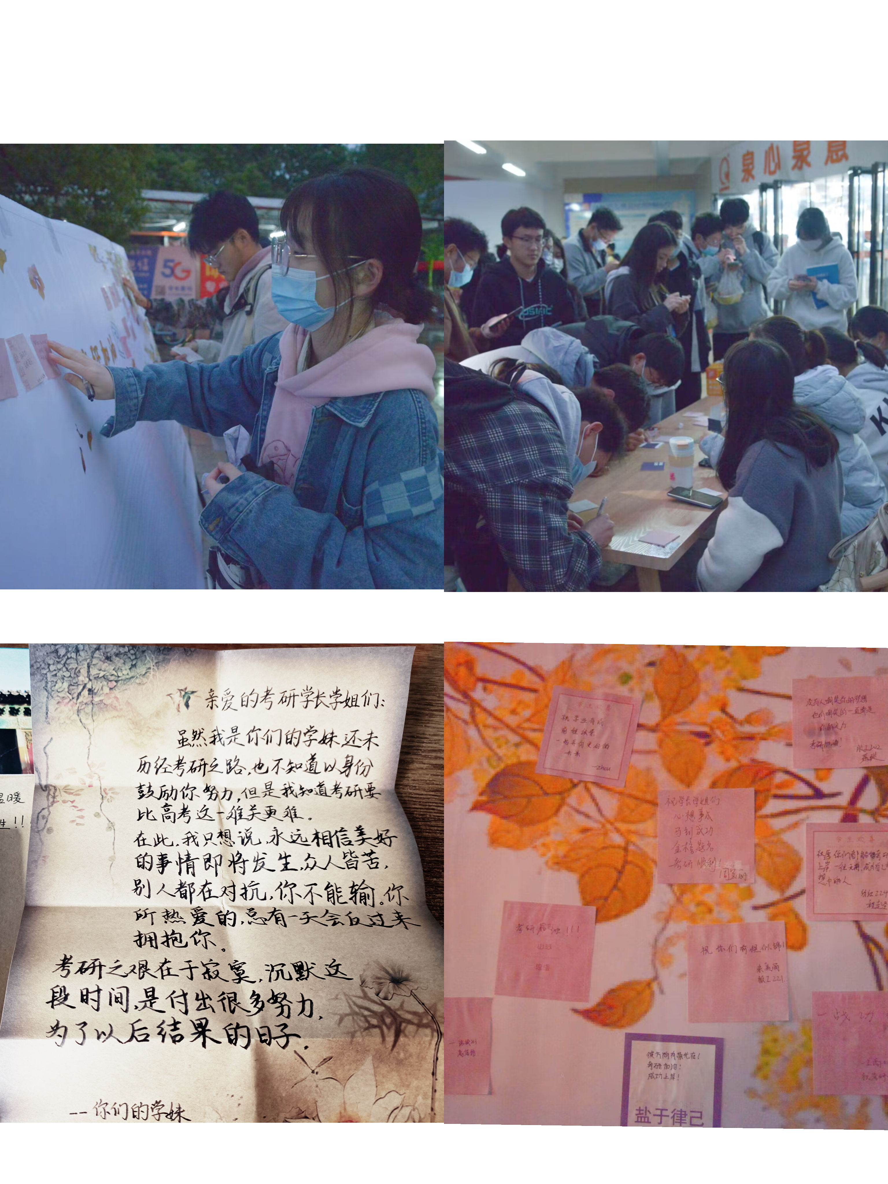 每到一处,学院领导们细心询问学生考研备战、求职面试的准备情况,耐心解答同学们考研就业的疑惑和困难,为考研学生送上“金榜题名”暖心大礼包,为求职同学送上“大鹏展翅”求职大礼包,预祝考研学子们一战成硕、求职同学们前程似锦!前期学院团委组织开展“情系考研生,研途送温暖”活动,鼓励同学们在卡片上写上对学长学姐温暖的祝福,为他们在考研的道路上再次助力。“不畏风雨,不惧艰险”,“当下如水,未来如诗”,“考研上岸,一切顺遂”……一张张便利贴写满期待,一句句鼓舞充满希望。收到祝福的同学十分开心,向学院领导老师和学弟学妹们表示衷心的感谢以及坚持奋斗的决心。