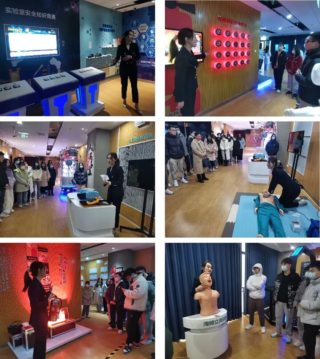 在进行教学体验后,同学们自行讨论、有序参与体验各个项目。在本次教育活动中,三维仿真结合VR技术展现与现实社会相同的环境,场景中人物与故事的互动性,多种急救方法、毒品危害和火灾等体验感逼真,同学们快速学会处理相关安全事件、实验室消防应急处理办法等日常安全知识。