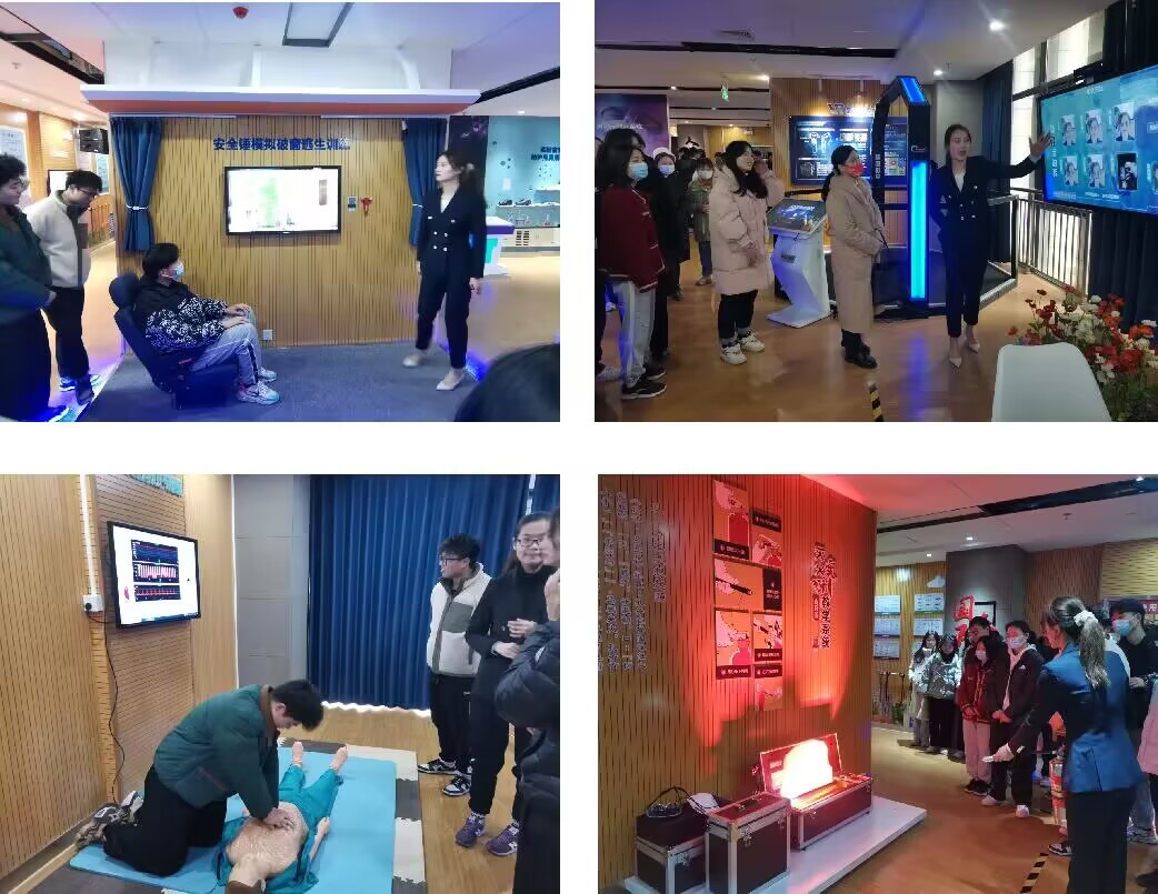 该安全教育实验室分为九大体验板块,21个体验项目。保卫处李岗科长安排讲解员,同学们参观北斗导航、辽宁舰、“基洛”级潜艇、99式主导坦克、长征系列火箭、东风-31弹道导弹、歼31鹘鹰战斗机、以及量子科学实验卫星“墨子号”等模型,学习和体验安全锤模拟破窗逃生训练、灭火实训教学系统以及油锅起火扑灭、AED操作训练、心肺复苏、海姆立克训练、超感教室VR安全技术体验、系统等各种项目。