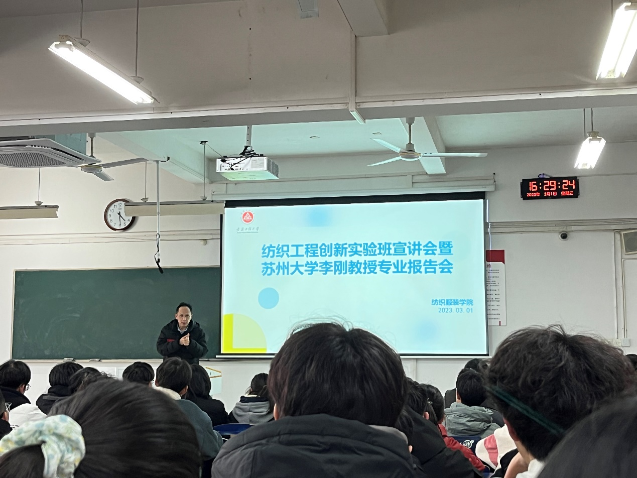 2023年3月1日下午,纺织服装学院于6教111教室开展2022级纺织工程专业创新实验班选拔宣讲会暨苏州大学李刚教授专业宣讲会,副院长陶旭晨、系主任王英沣、班主任赵宝宝、辅导员童超梅及纺织工程2022级全体学生参加了此次会议。会议由童超梅主持。