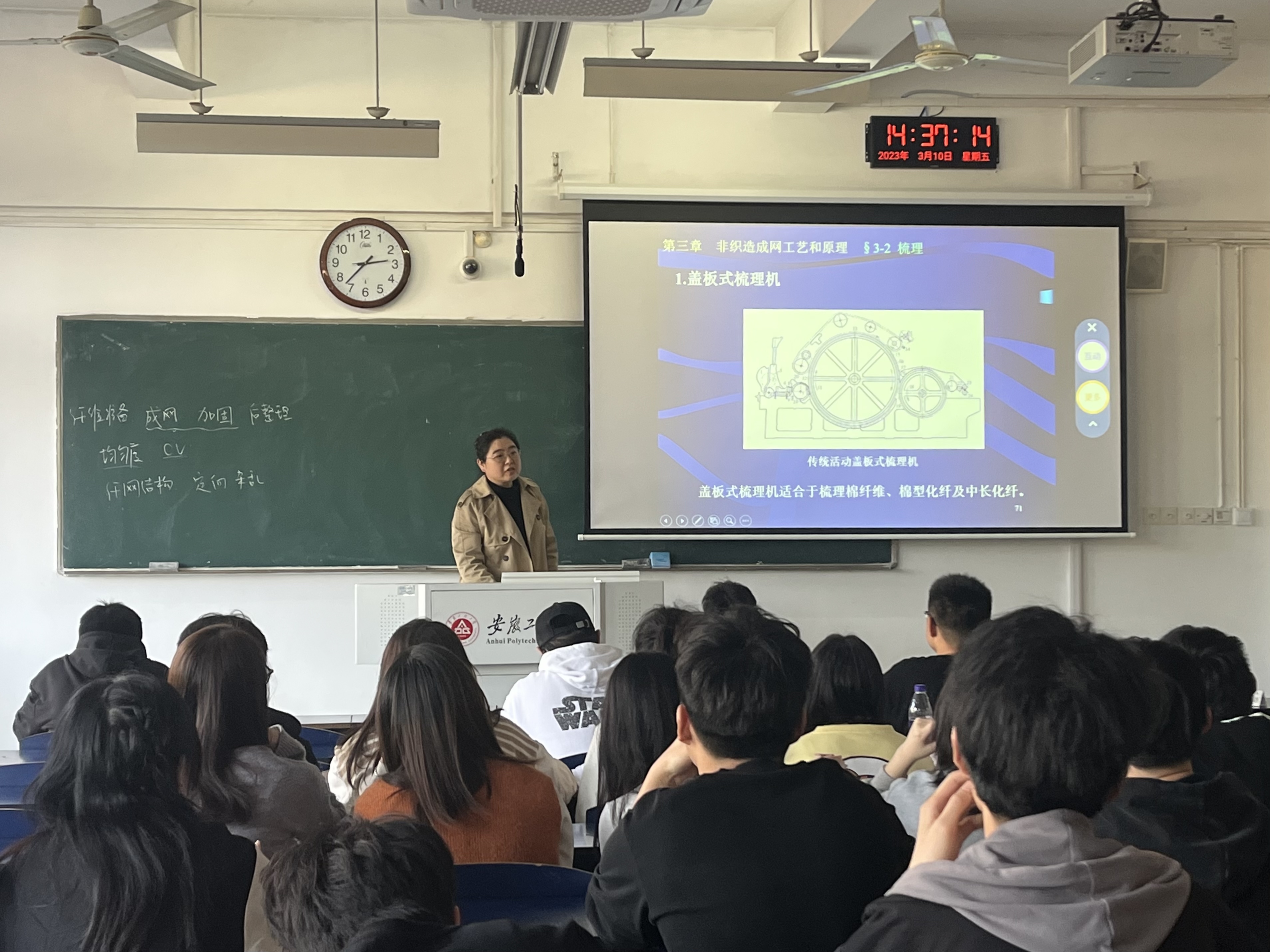 本次“金”彩一课,授课章节为《非织造原理》第三章—短纤维成网工艺与原理。她利用教学内容之间的关联性,通过课程回顾,引入本次教学内容主题;通过提问互动环节,了解学生对知识点的掌握情况,成功调动学生的学习积极性,课堂气氛活跃。