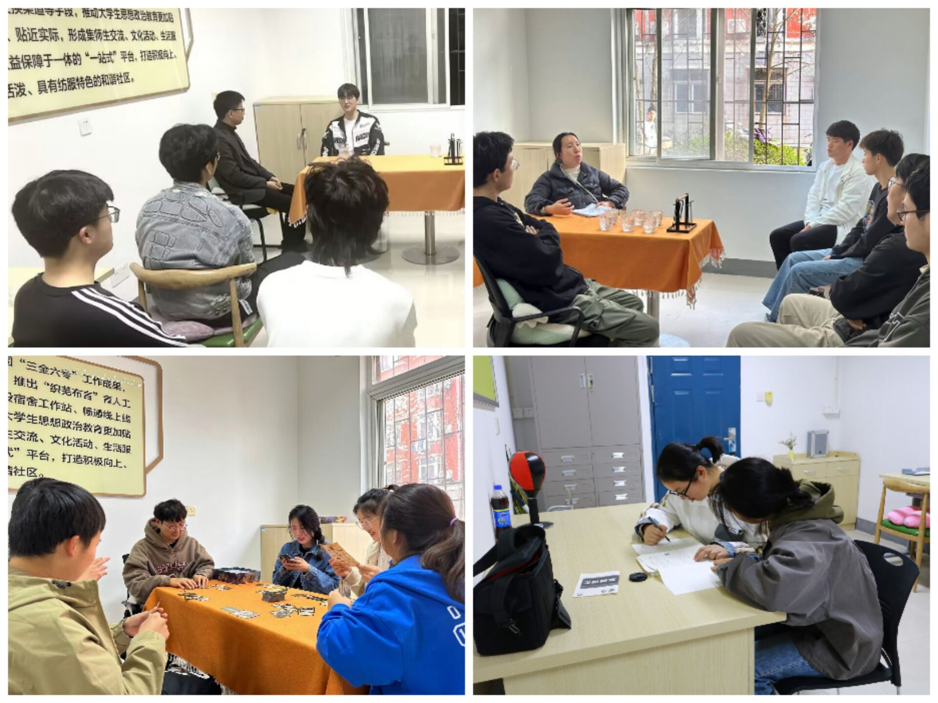 工作站第一期先后举办了“绽放青春,共同进步”朋辈学习帮扶、“心灵之源,赢在寝室”寝室问题疏导、“暖‘心’小窝,快乐生活”心理解压游戏、“徜徉文艺之风,共筑和谐寝室”宿舍文艺作品评比、“创文明寝室造活力校园”寝室长谈心会等活动。打造“学习互助、问题疏导、心理解压、素质提升、工作改进”等全方位的宿舍交流平台,逐步构建形成集“学习交流、听取意见、问题解决、活动推进”为一体的师生“织芜不言”宿舍工作站工作模式。