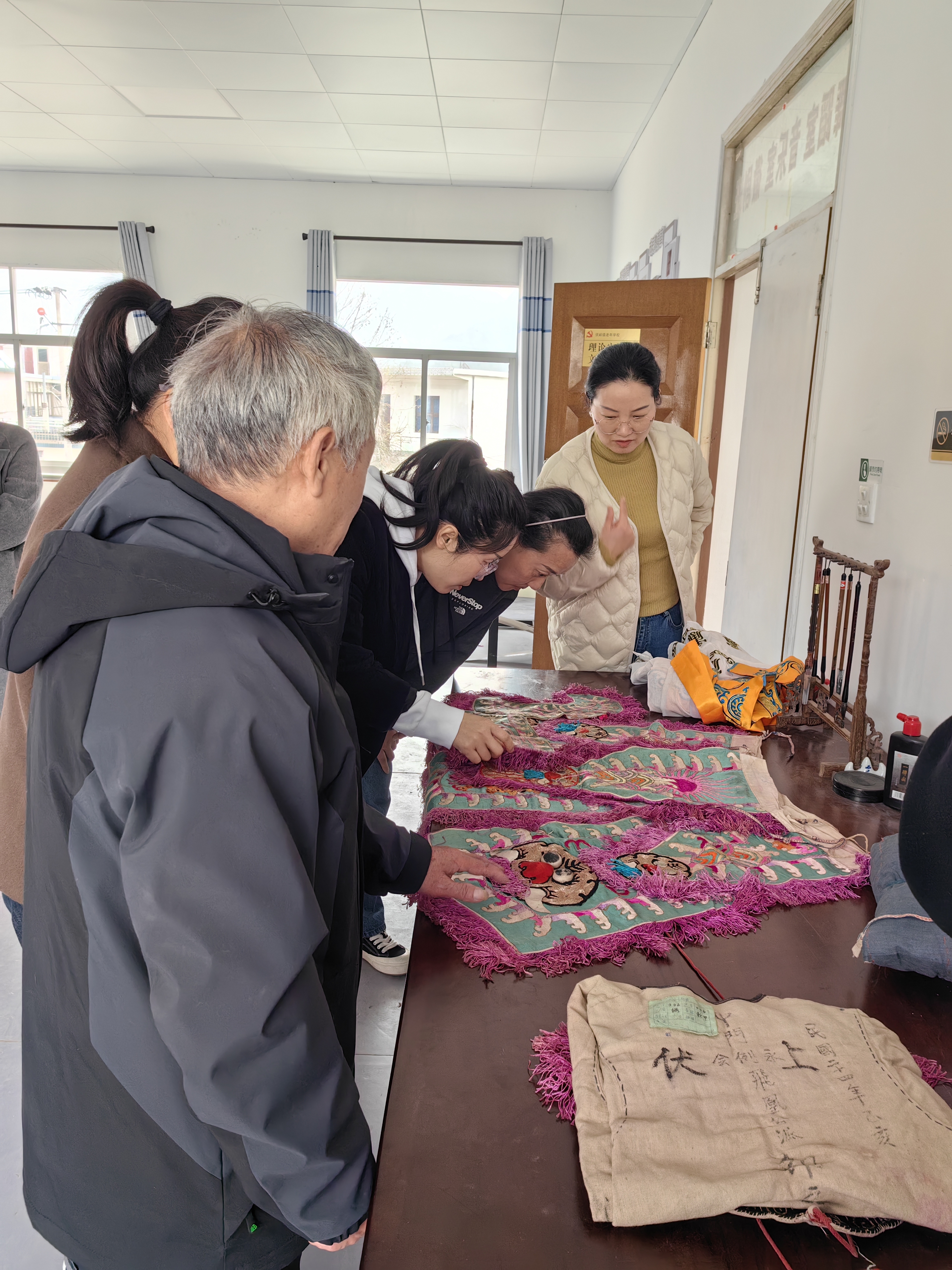 在当地组织部、团委和文化站负责人的陪同下,徽剧传承人介绍了徽剧的历史以及徽剧戏衣收藏现状,查看了目前留存下来的戏衣实物,询问了戏衣保护方面存在的困难和问题。随后,双方进行了深入的交流,在徽剧戏服保护、传统纹样挖掘、数字化传承以及文创创新等方面达成了共识,下一步双方将针对此非遗项目展开深度合作,为徽剧传承做出贡献。