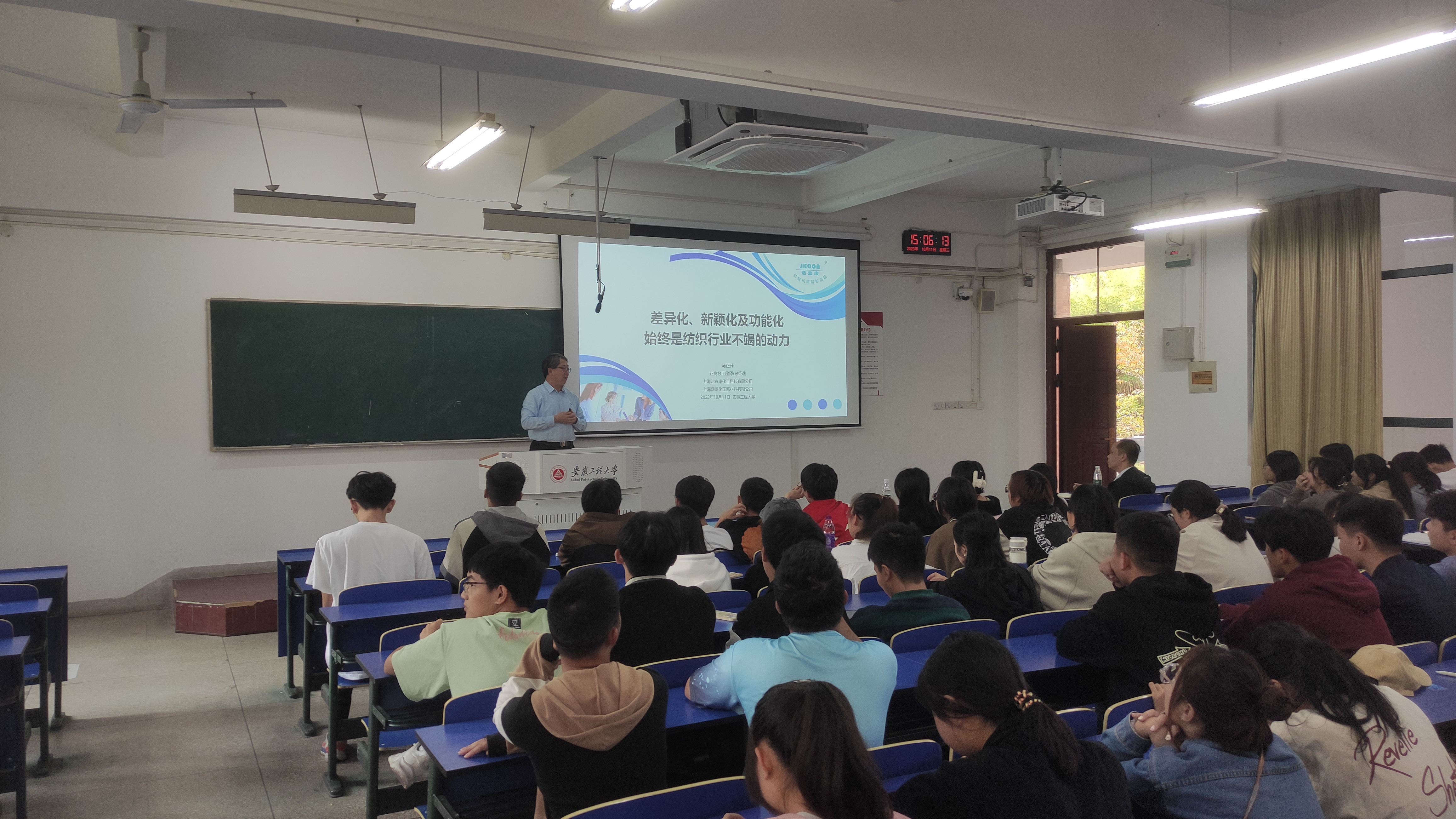 为进一步深化产教融合、校企合作,10月11日,纺织服装学院邀请双聘博士(上海洁宜康化工科技有限公司)马正升教授级高级工程师为纺织工程、非织造材料与工程专业23级新生以及轻化工程专业22级在校生上了一次题为“差异化、新颖化及功能化始终是纺织行业不竭的动力”的精彩课程。