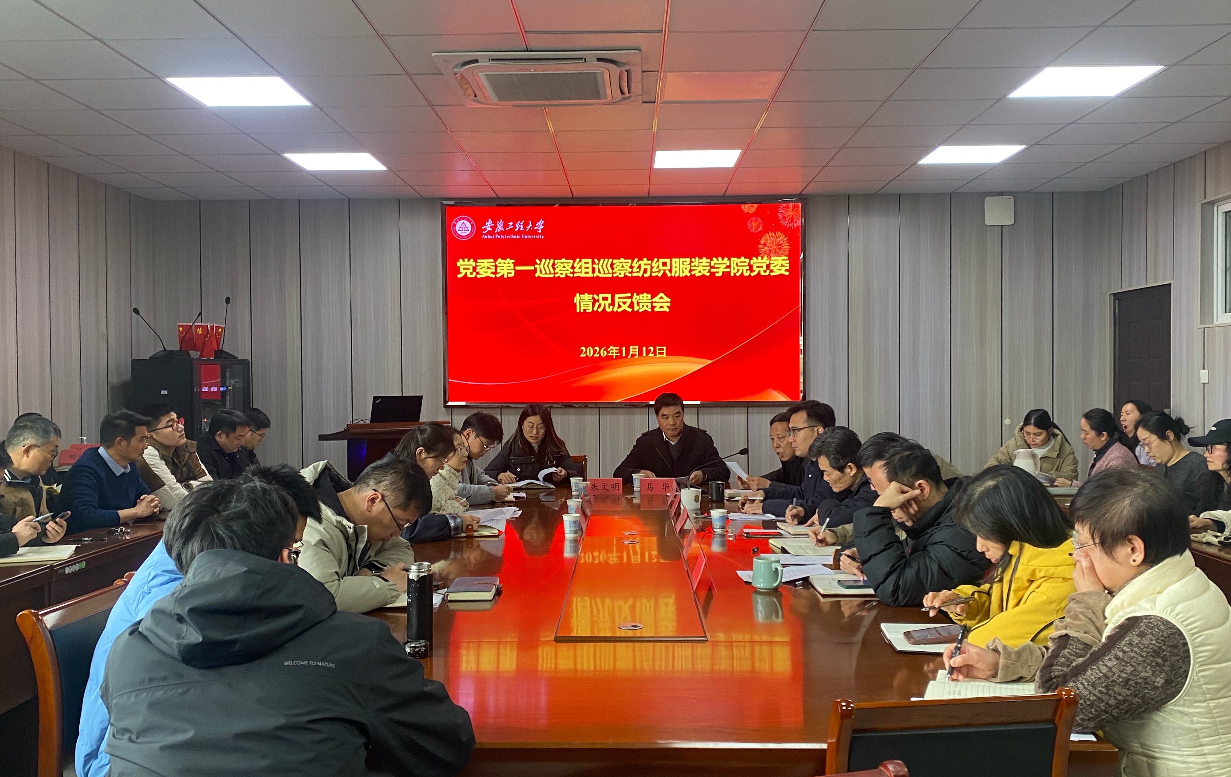 第一巡察组副组长朱文明及有关同志、纺织服装学院领导班子成员、学院师生代表出席会议。