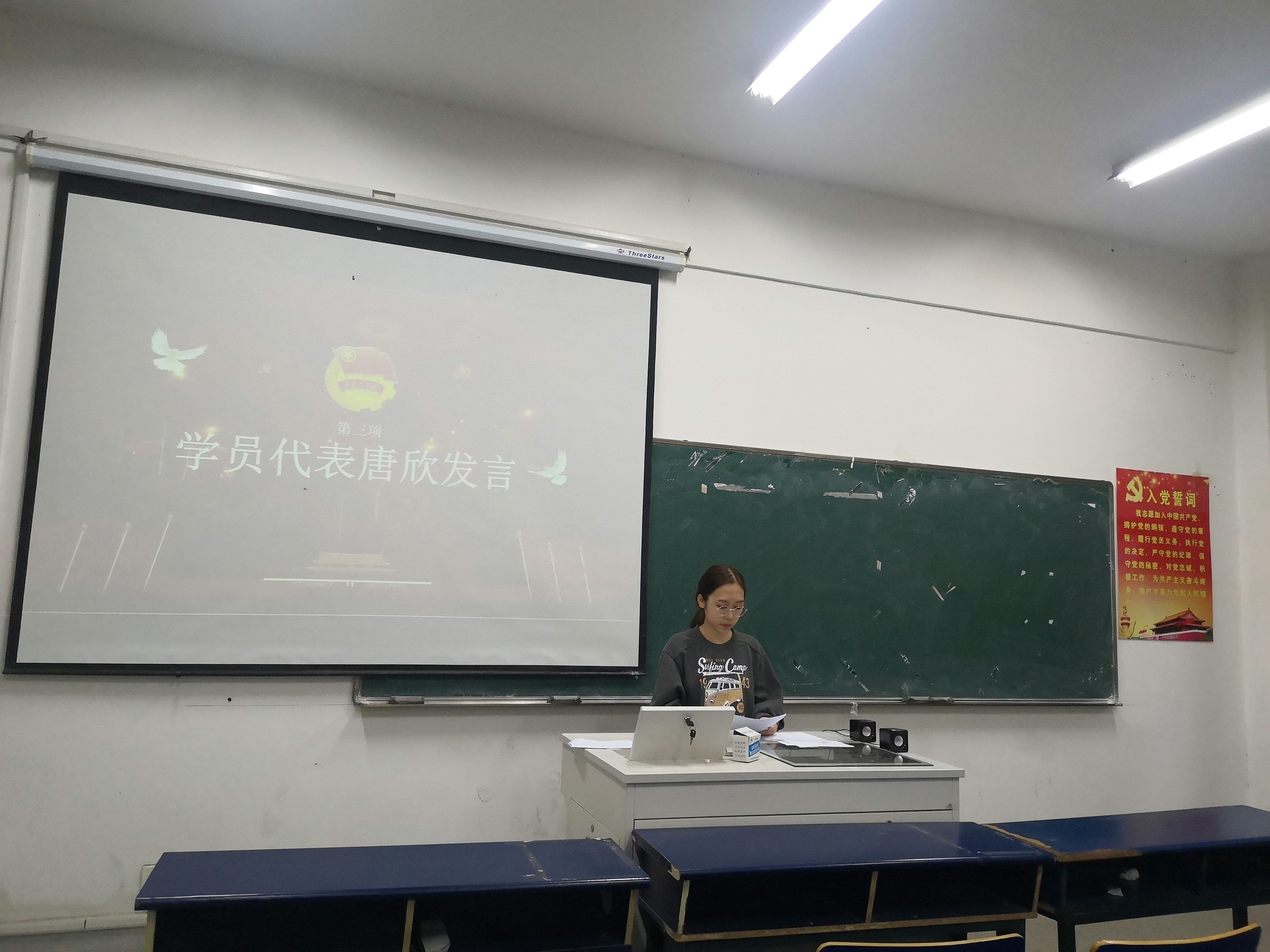 典礼在整齐划一的共青团团歌声中开始,服工191班唐欣作为本次青马班优秀学员代表发言,感谢学院为青年大学生成长提供的学习平台,她表示作为新时代青年,一定不忘组织的关心和教育,坚定理想信念,不忘初心,牢记使命,勇做时代弄潮儿。