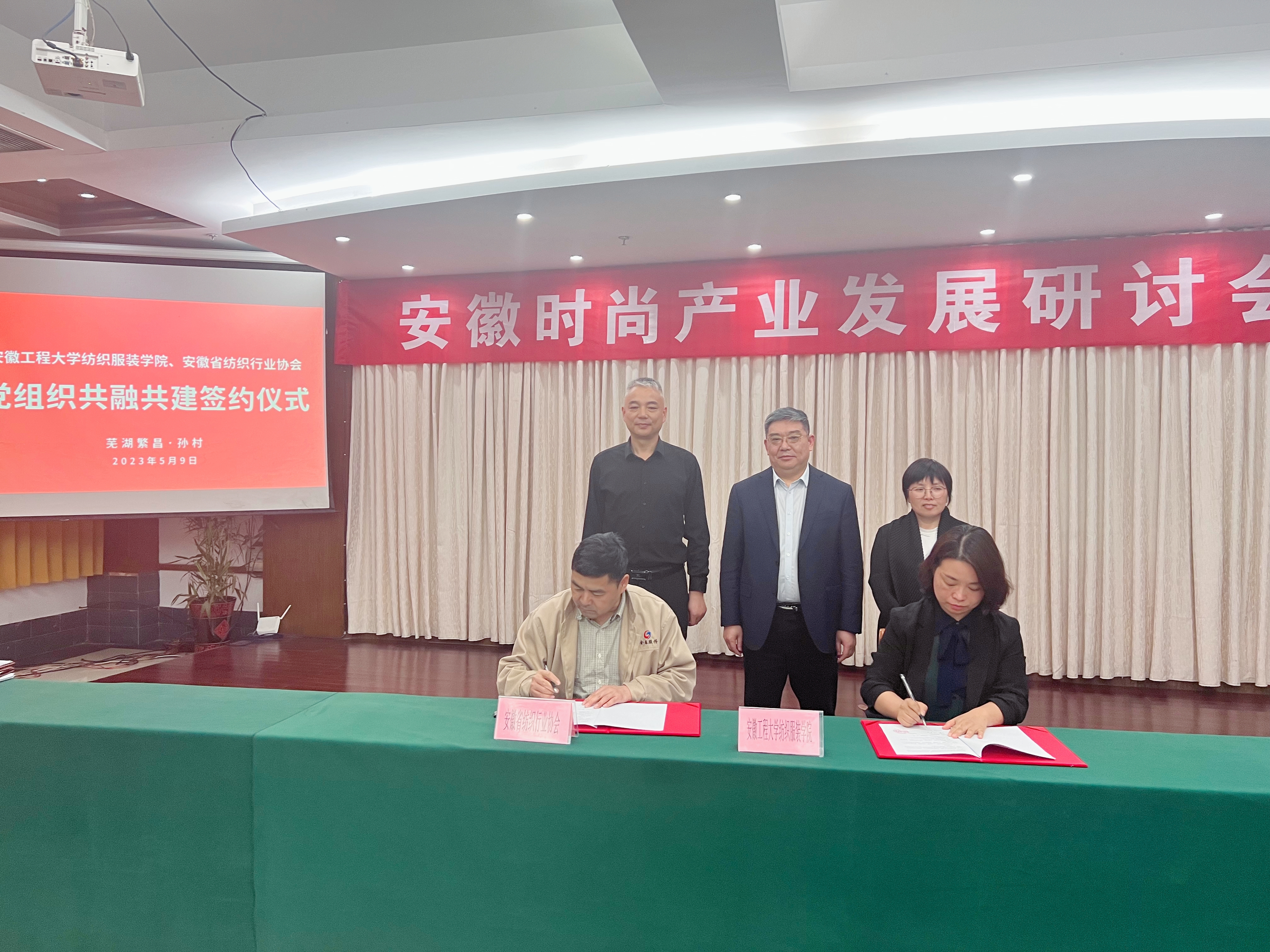 在5月9日下午召开的安徽时尚产业发展研讨会上,RayBetApp官网下载 纺织服装学院党委和安徽省纺织行业协会党支部联合共建协议书签订仪式一并举行。
