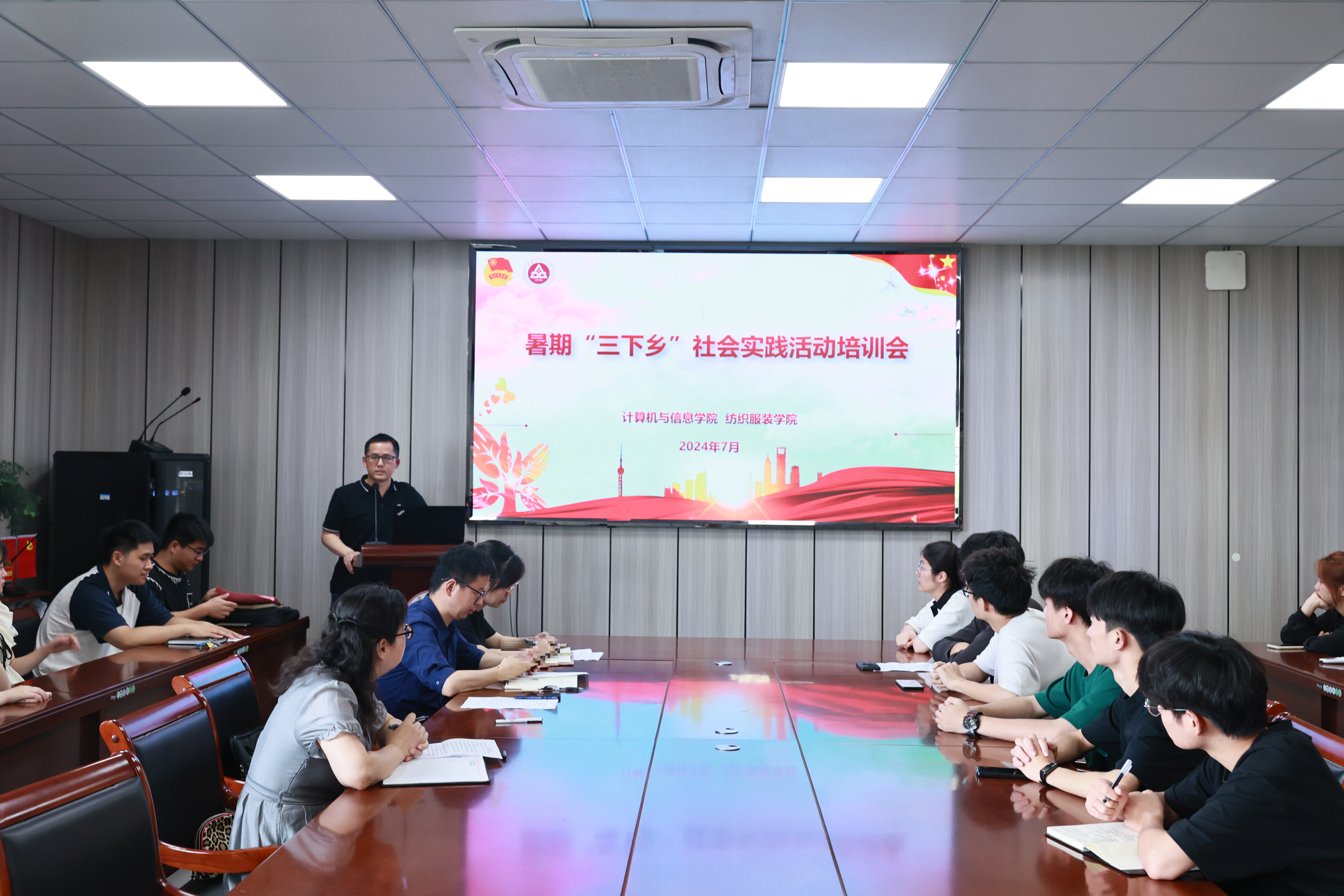 7月3日,纺织服装学院、计算机与信息学院在D座413会议室召开2024年暑期“三下乡”社会实践活动培训会,校团委副书记周海林、计算机与信息学院党委副书记孙德茹、纺织服装学院党委副书记梁雪松、实践团队指导老师、学生负责人参加。会议由计算机与信息学院团委负责人孙力力主持。