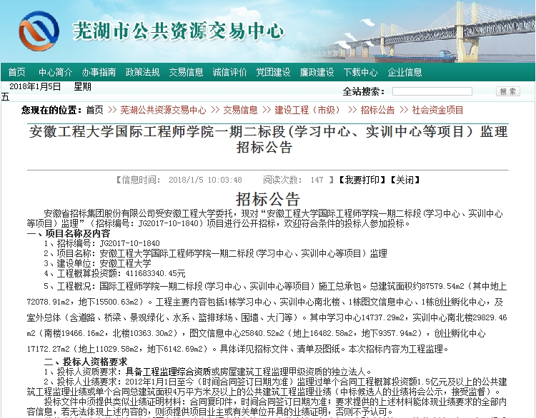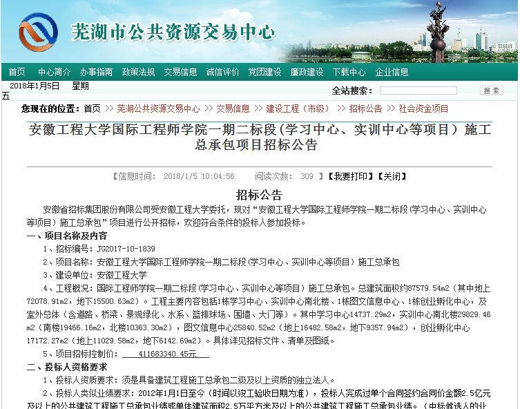 2018年01月05日:国际工程师学院一期二标段(学习中心、实训中心等项目)施工总承包、监理挂网招标。