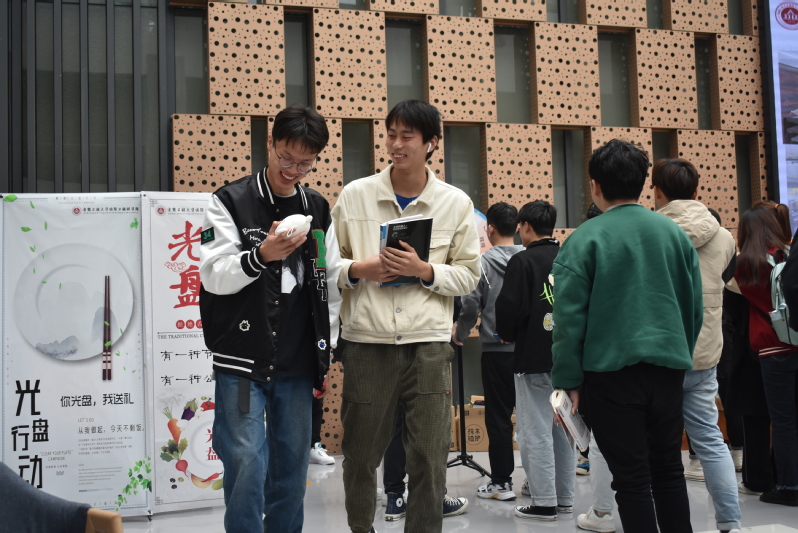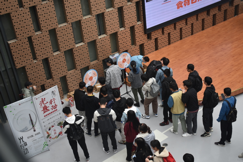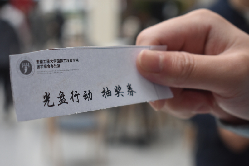 活动中,学生用餐结束后,凭借光盘即可向餐具回收处的工作人员领取一张抽奖券,在一楼大厅内转动轮盘进行抽奖,奖品有玩偶、抽纸、酸奶、餐券等。