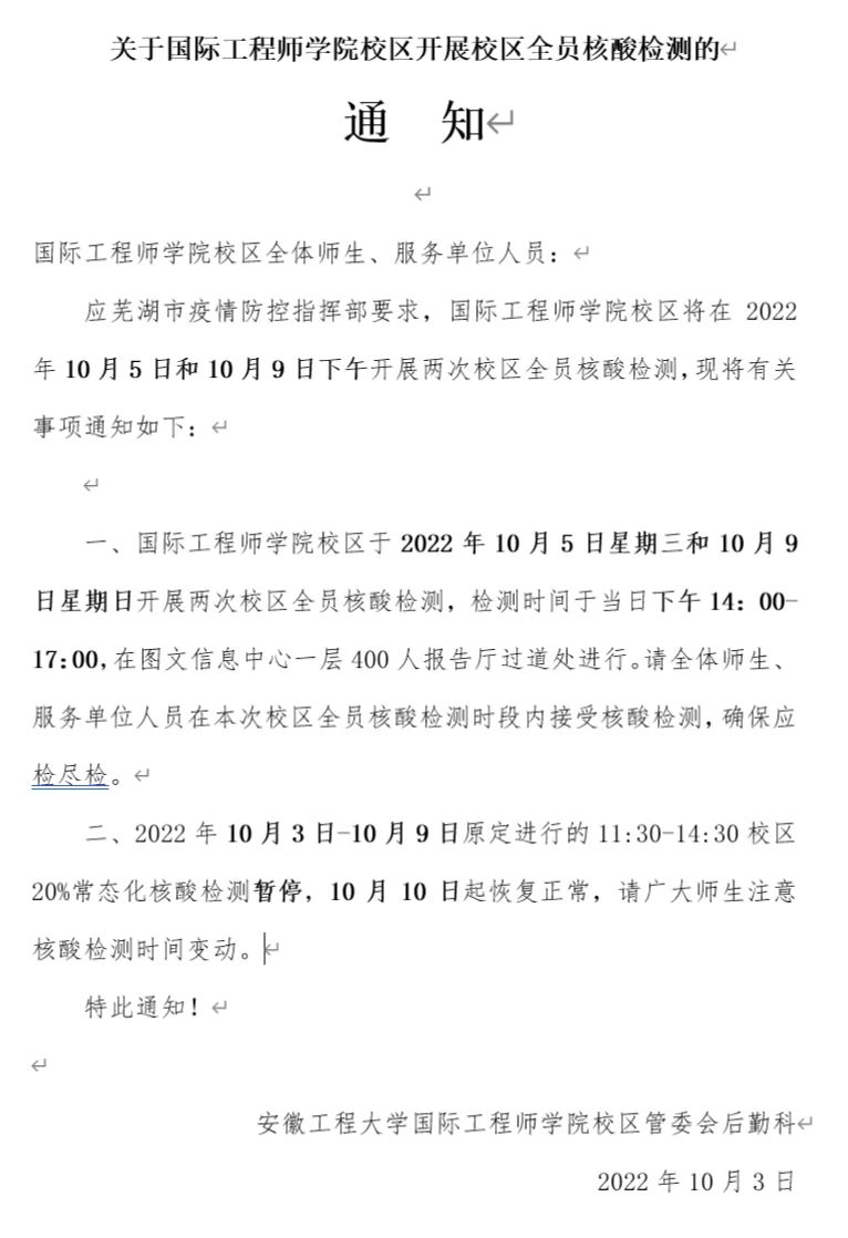 关于在国际工程师学院校区开展全员核酸检测的通知