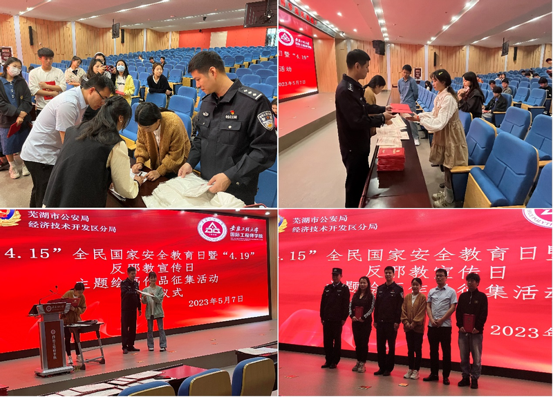 5月7日,“4.15”全民国家安全教育日暨“4.19”反邪教宣传日主题绘画作品征集活动颁奖仪式在国际工程师学院校区图文信息中心一楼大报告厅举行,芜湖市公安局经济技术开发区分局国保反恐大队副大队长周峰出席活动,为52名获奖选手颁奖,颁奖仪式由管委会保卫科徐伟主持。