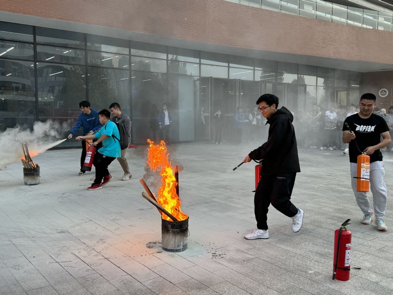 在人员疏散至安全地带后,消防队员讲解了火灾时的自救与逃生知识、灭火器和消火栓的正确使用方法,并组织大家使用灭火器进行实操演练。随后,消防队员模拟火灾救援场景,到达“火灾现场”后,立即启用干粉泡沫联用车和举高喷射车进行模拟灭火,激起了在场学生浓厚的兴趣。