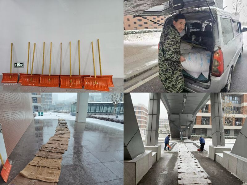 管委会协同物业公司采购了工业铲雪锹18把,防滑麻袋100个,工业盐600公斤,警示牌等防寒防冻防滑物资。联合电气工程学院(集成电路学院)、机械工程学院、人工智能学院、物业工作人员开展学生书院、学习中心、图文信息中心、实训中心、孵化中心、食堂等重点区域之间主次干道、人行道路的扫雪铲冰工作,并铺设防滑麻袋,保障师生出行安全畅通。