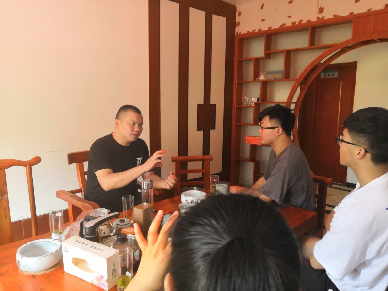7月4日上午,团队来到了天华镇龙头企业—“画里天华”有限公司调研,公司老总曹双乐热情介绍了天华镇茶果产业的发展历史及如今发展状况,带大家品尝了当地种植的茶叶,茶叶汤色清澈,叶底匀嫩,滋味醇和,香气持久。之后,曹总带领团队们参观了占地两万多亩的茶果种植基地和茶叶生产车间以及他最近新开发的产业——特色茶家乐。茶家乐是通过宣传茶文化和娱乐有机结合的方式,来吸引消费者的目光,扩大当地人流量,从而在提高当地知名度的同时,提高利润。
