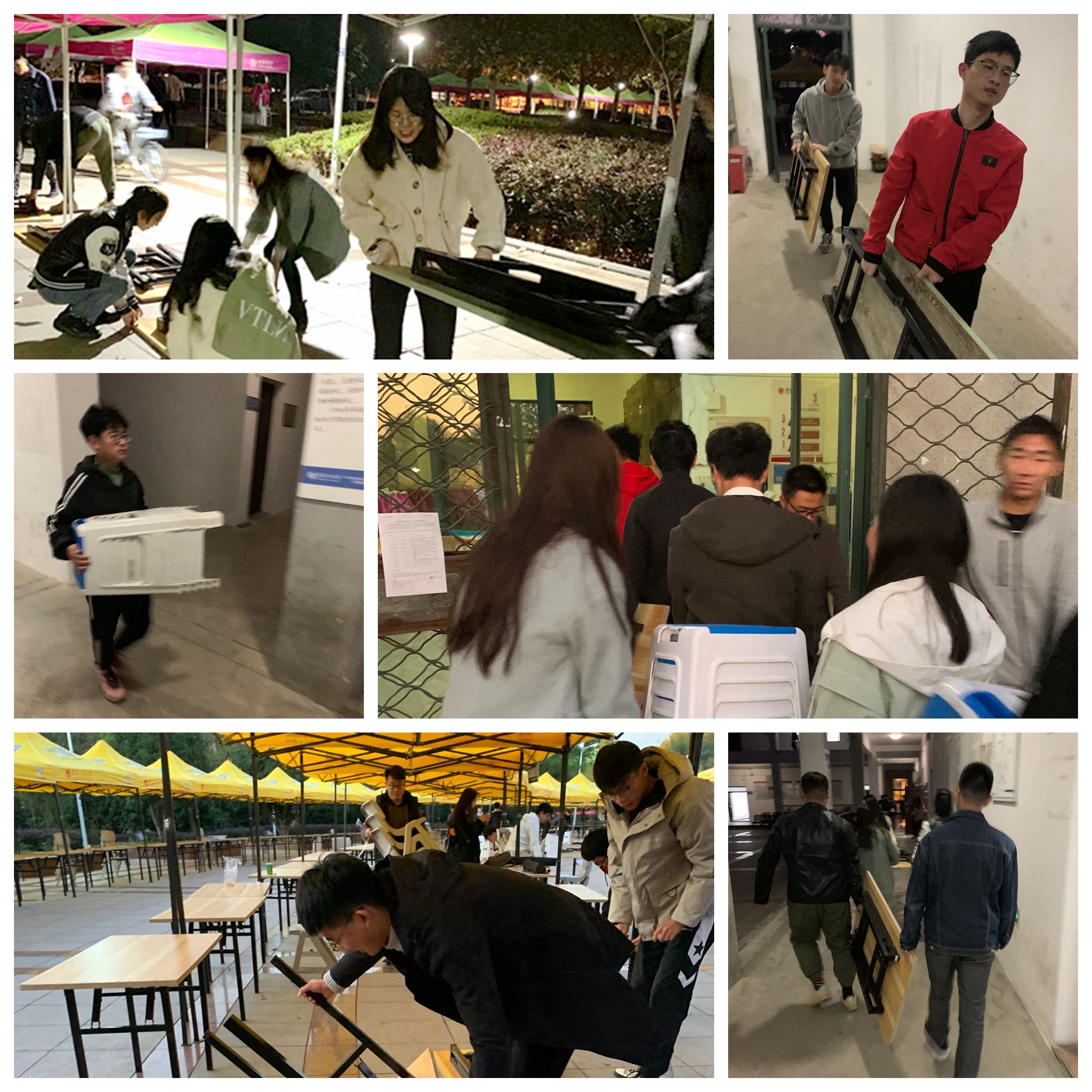 本次志愿服务活动在校秋季招聘会结束后开始,支部党员在就业指导中心工作人员的引导下,有条不紊地折叠长桌,收拾椅凳,拆卸帐篷挂牌,将物品送回教室摆回原位。活动结束时天色已黑,路灯初放。
