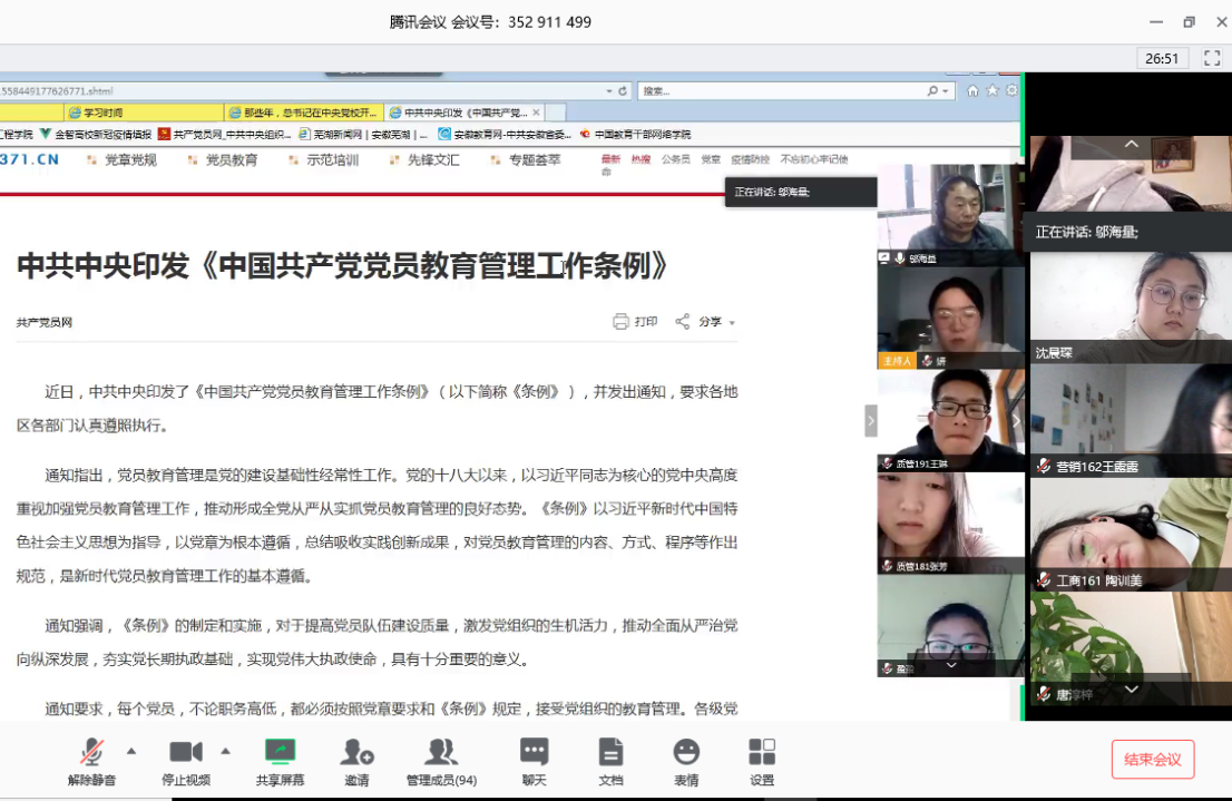 3月21日下午,院党委书记邬海量在腾讯会议网络平台为第九期预备党员培训班作开班动员。组织员朱文明、本期培训班班主任赵妍及全体学员参加了动员会。邬海量介绍了本期培训班的前期准备情况和院党委的工作要求,希望学员在党课学习过程中不断提高政治觉悟,在这次抗击疫情的斗争中接受党性教育和思想洗礼,不断增强“四个意识”、坚定“四个自信”、做到“两个维护。赵妍对本次网络培训进行了详细的布置与安排,要求学员们严格要求自己,积极参与网络学习讨论发言,提高自身思想觉悟和政治素养。