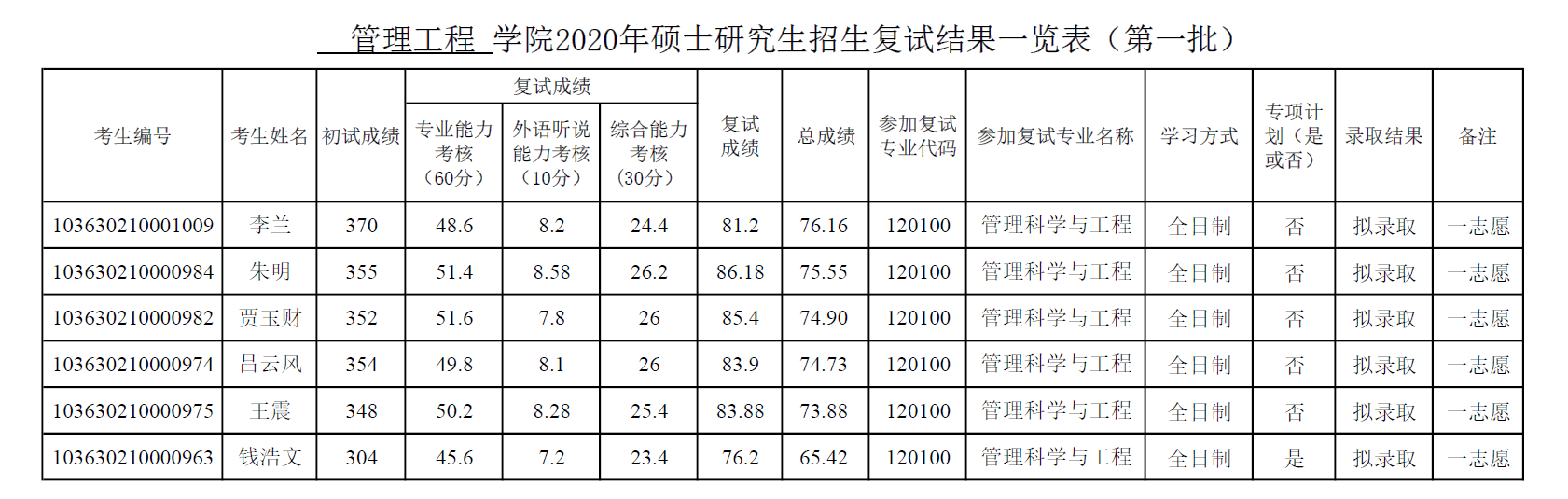 管理工程学院2020年硕士研究生招生复试结果(第一批)