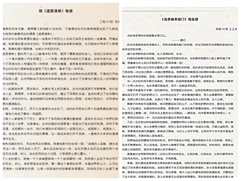 本次活动根据防控实际,寓教于乐,同学们积极踊跃报名参加,把电影中传播的正能量书写下来,建立健康的心理和心态,用积极向上的心态对待生活中遇到的问题,共同面对病毒,向疫情期间无私奉献的人们致以崇高的敬意,也祝愿所有病痛都会被温暖治愈。最终有216名同学提交了活动感悟作品,在这些作品中,学院挑选了两篇优秀作品在微信公众号上进行了展示。