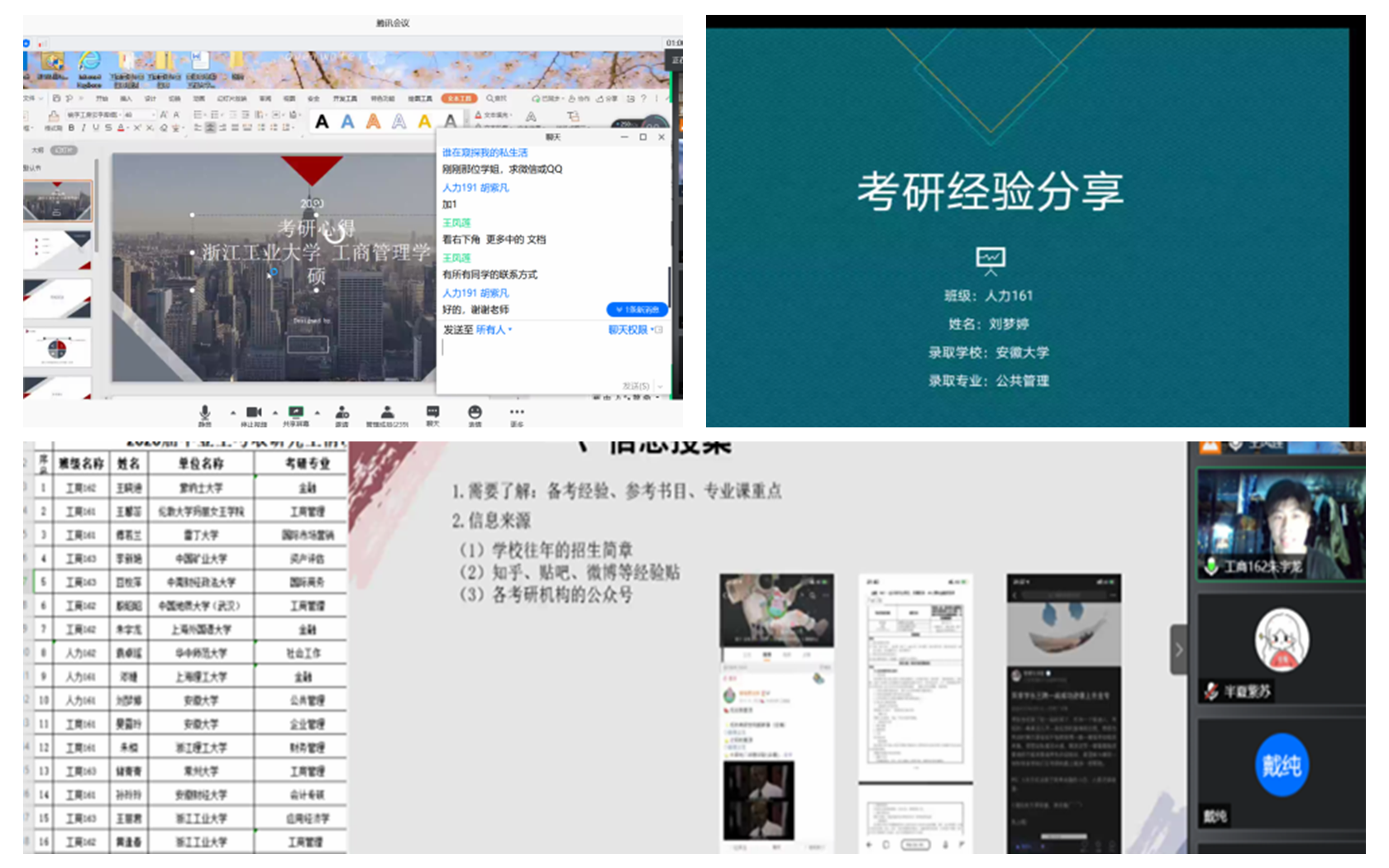 为帮助工商管理、人力资源管理专业准备考研学生掌握相关考研技巧、增强考研信心、提高考研成功率。6月9日,工商管理系教师党支部“双带头人”工作室借助“腾讯会议”平台举办了2020年考研经验交流会。本次“云交流”邀请了部分党员教师和考取蒙纳士大学、中南财经政法大学、中国地质大学(武汉)、中国矿业大学、华中师范大学、上海外国语大学、安徽大学的20余名优秀考研毕业生参加,吸引了2017、2018、2019级的250余名同学的积极参与。交流会由工商管理系教师党支部书记王凤莲主持。