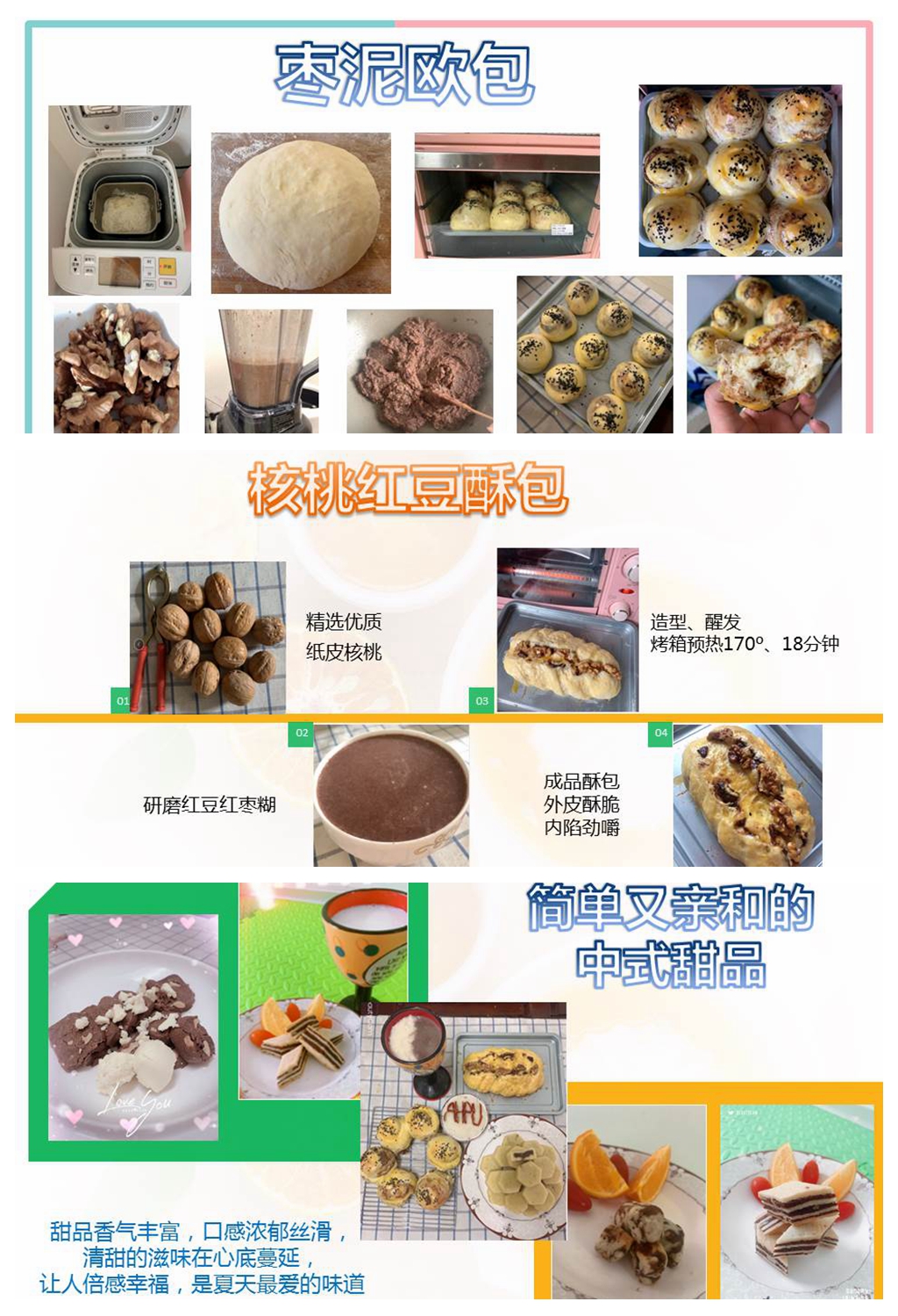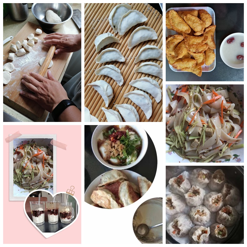 活动收到31位老师提供的美食作品,各样菜品菜式虽然都是普通家常菜,却一点都不简单,处处透着灵巧的心思。面食总动员,面粉搭配上大枣、红豆等,蒸、烤、煎,制作成欧包、桃酥、核桃包、凉皮、面条、包子;五谷杂粮,可榨汁、可煮粥,作为早餐简单富有营养;核桃可糖炒、可凉拌,色、香、味俱全,简单的食物呈现了暖心的味道。