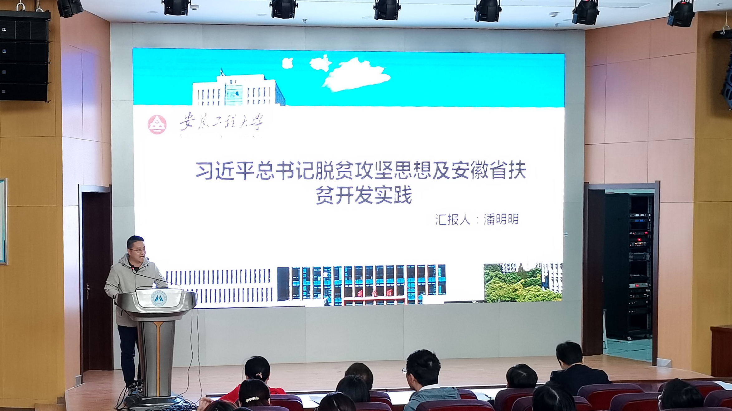 潘明明结合自己的申报的国家社科项目的专业研究,阐述了脱贫攻坚思想形成脉络、思想内核,并详细解读了安徽省扶贫开发的实际情况,对安徽省扶贫开发未来做了思考和交流。在谈到学习体会时他说:当前脱贫攻坚工作已到最后决战决胜的收官阶段,一定要深入学习贯彻习近平总书记视察安徽重要讲话精神,把防止因疫因灾致贫返贫摆在突出位置,坚持精准扶贫,抓紧灾后重建,确保高质量打赢脱贫攻坚收官战。