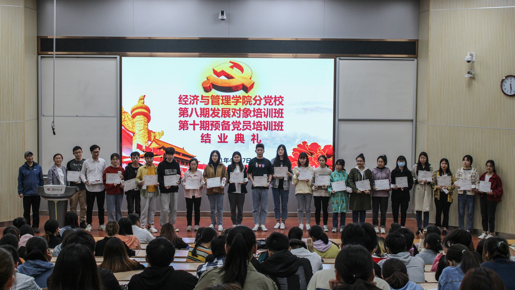 4月27日下午,经济与管理学院分党校第八期发展对象培训班、第十期预备党员培训班结业典礼在2教报告厅举行,院党委书记邬海量、院党委副书记程繁、组织员朱文明、培训班班主任及全体学员出席典礼。结业典礼由发展对象培训班班主任赵妍主持。