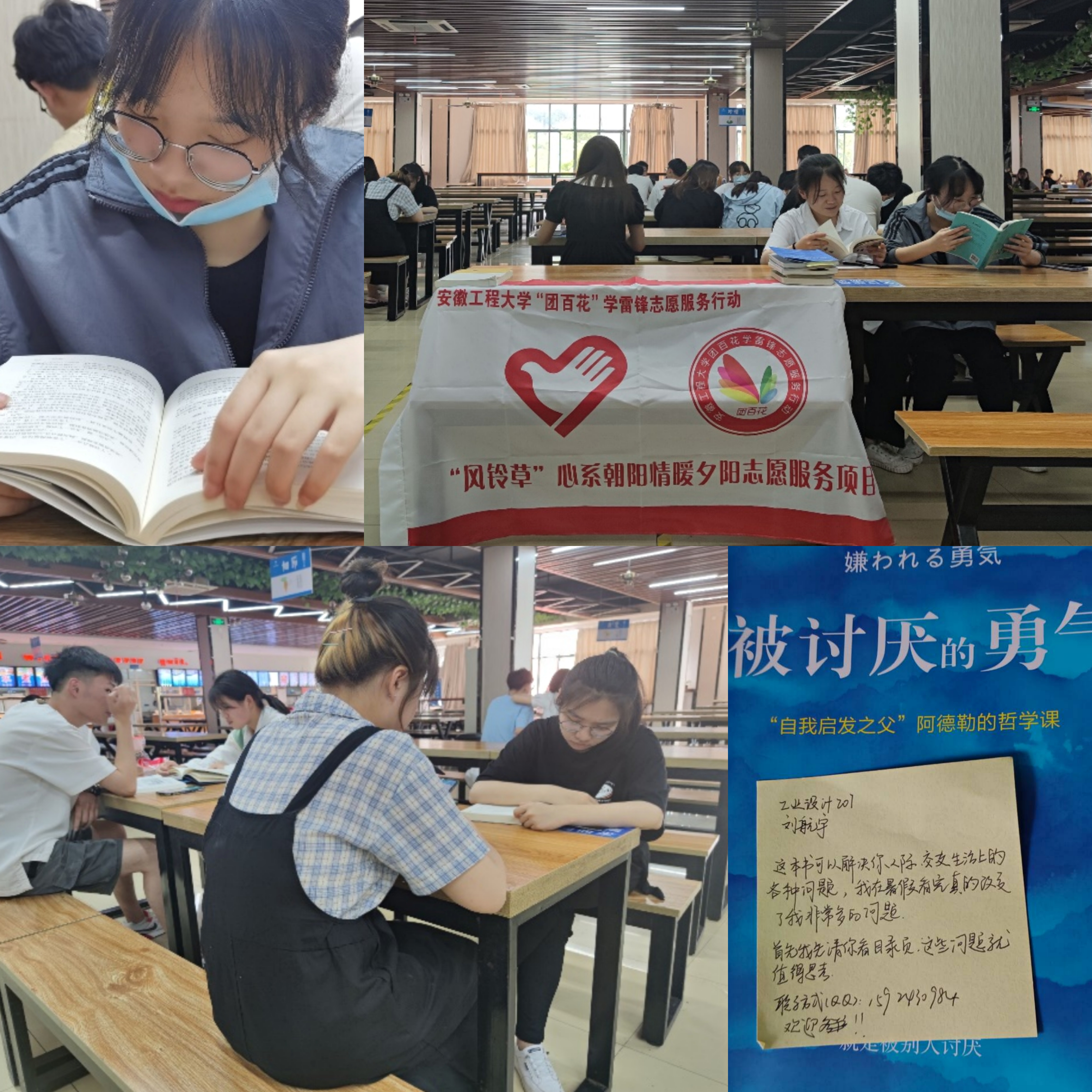 其中,不乏有温暖的瞬间。来自工业设计专业的刘航宇同学在自己的书中附上便签,上面写着他读完该书的感受以及希望他人能够通过阅读此书而同样有所收获。林语堂先生曾说:“读书是至乐的事”,如其所言,正是在阅读这本《被讨厌的勇气》书后,让他解决了很多人际交往方面的问题,从而收获了阅读后的快乐。也正是他的乐于分享,让其他阅读这本书的人也能够被该书所治愈。