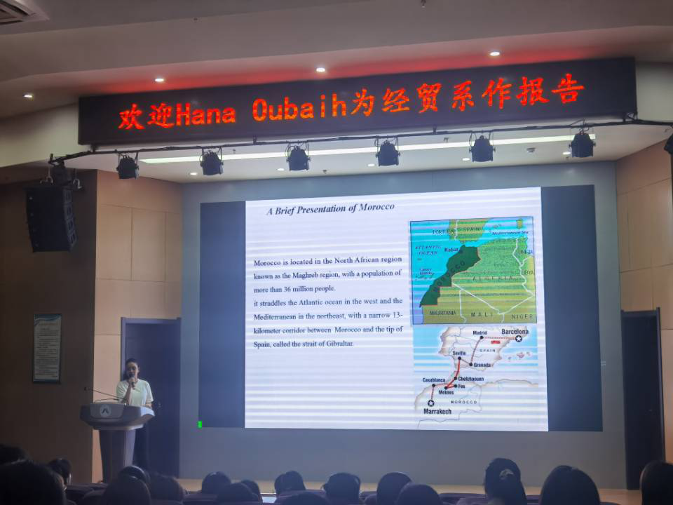 当前,随着我国加快构建“双循环”新发展格局,加快推动世界经济摆脱“长期停滞”,中非经贸合作必将释放更大的发展动能和活力。Hana Oubaih女士以自己国家——摩洛哥为例,从摩洛哥地理位置、经济发展水平出发,系统全面地介绍了其优势产业与产品、对外经济贸易政策,特别针对其进口政策及进口产品系列,分享交流了如何走进非洲、如何有效开拓非洲市场。会后,同学们踊跃发言,与Hana就进一步了解非洲、走入非洲、与非洲国家进一步经贸合作进行了深入交流。