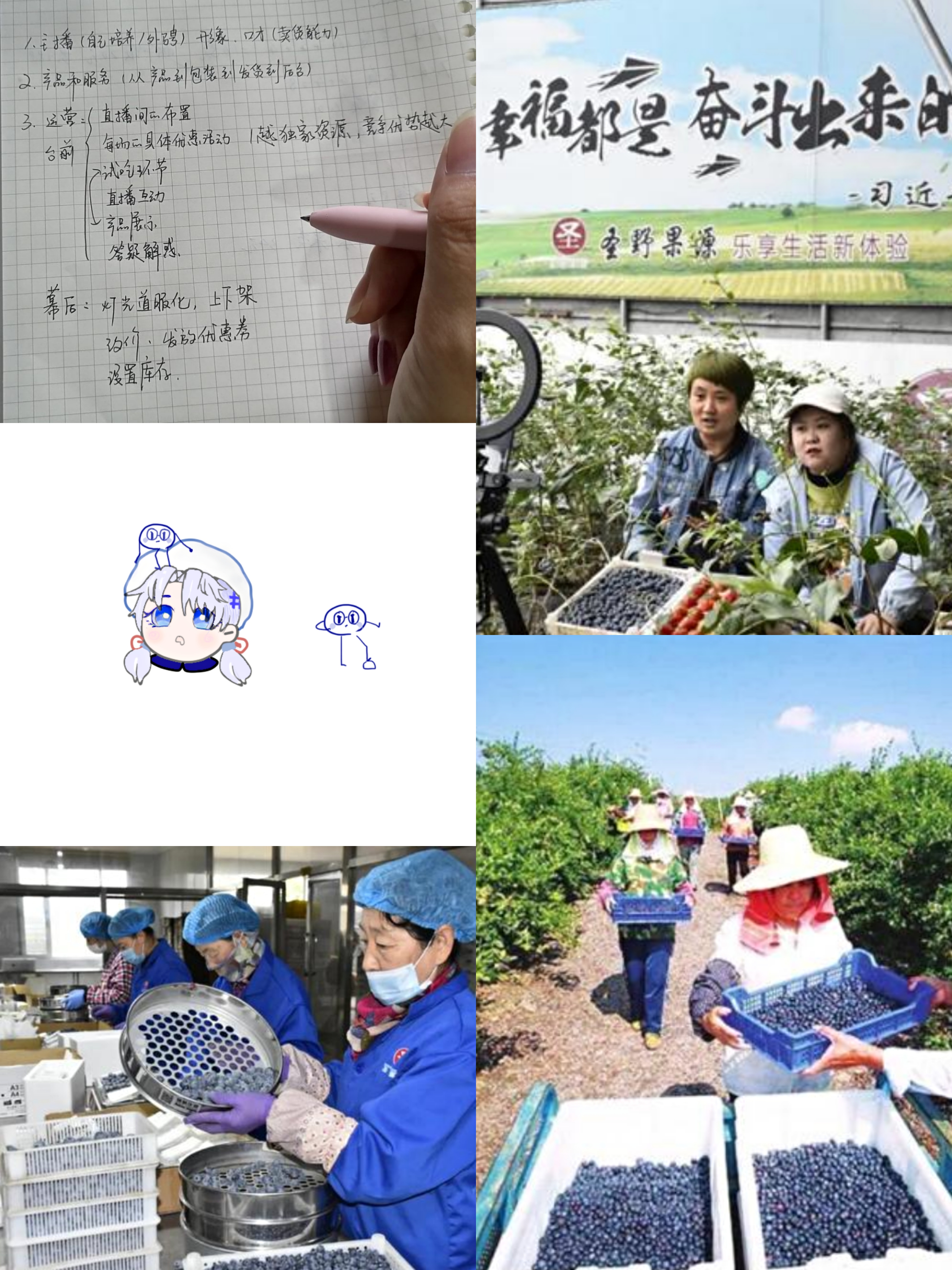 7月下旬,团队抵达怀宁县黄墩镇蓝莓产业园种植基地,致力于蓝莓产品的种植与营销开展学习和探索。通过与果农的直接对话交流,团队成员发现,受疫情影响,怀宁县蓝莓线下销售量大幅度减小。基于此,团队开展了直播带货活动,对直播前期准备,直播带货培训,网店营销培训,电商技术培训,设计蓝莓图标等进行了建设性援助。同时,针对产品推广,开展了一系列宣传活动,在产品导入通过活动形式让产品形象深入群众,为进一步打开电商蓝莓销售渠道奠定了基础,团队还初步设计了“蓝小莓”形象初稿,致力于通过网络营销的模式,帮助怀宁蓝莓拓展营销渠道,延伸产业链,期望能助力当地果农、企业增加收入,以顺应乡村振兴的浪潮,为后疫情时期经济复苏添砖加瓦。