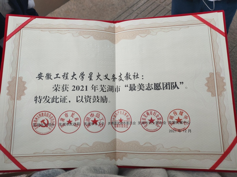 12月3日,芜湖市“12.5国际志愿日”主题志愿服务颁奖活动在芜湖市中山路步行街广场举行,2021年芜湖市“最美志愿者、最美志愿服务团队”受到表彰。我校星火义务支教社荣获芜湖市“最美志愿服务团队”奖项,10名星火义务支教社队员应邀参加现场颁奖仪式。校星火义务支教社是全市各条战线遴选出来的10个最美志愿服务团队之一,是唯一一所高校志愿服务团队。