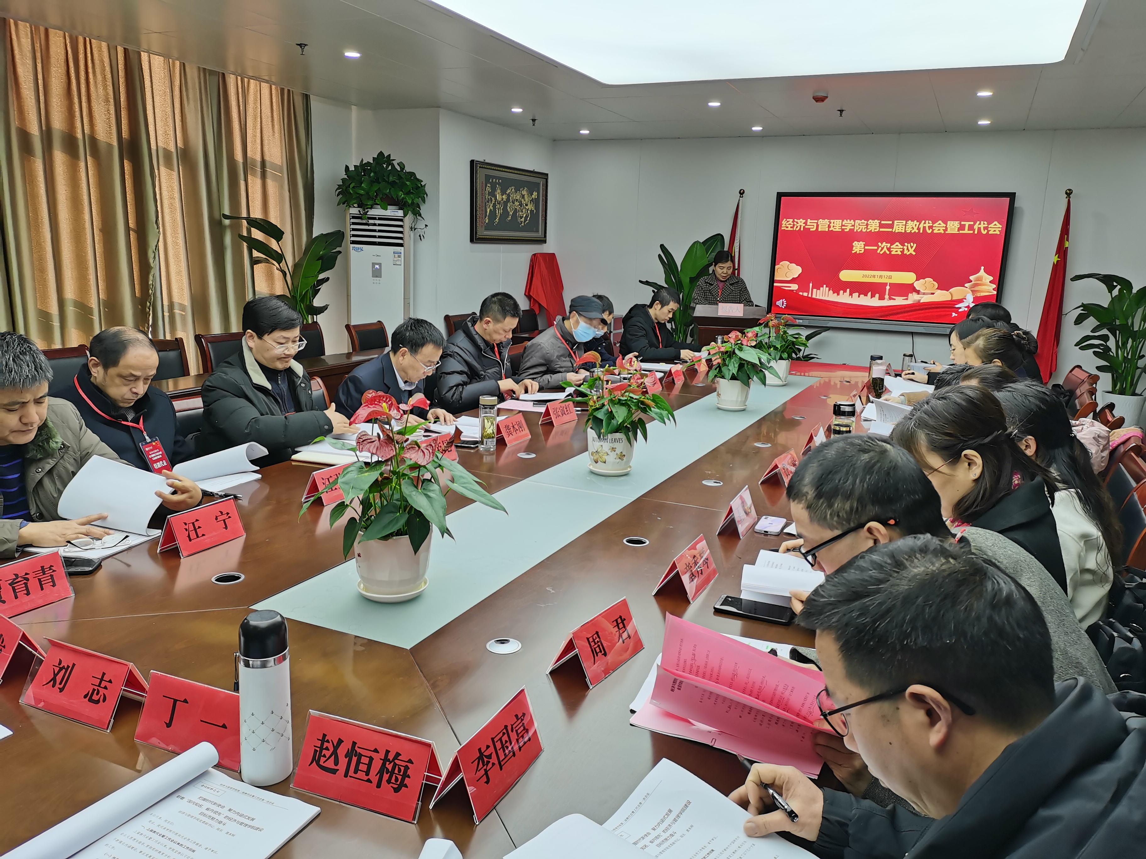 1月12日,经济与管理学院第二届教代会暨工代会第一次会议在C座818隆重召开。校工会副主席张寅红到会祝贺。学院教代会代表、工代会代表、特邀代表、列席代表共33人参加会议。大会预备会议和正式会议各阶段分别由学院党委副书记章兵,党委副书记、院长龚本刚主持。