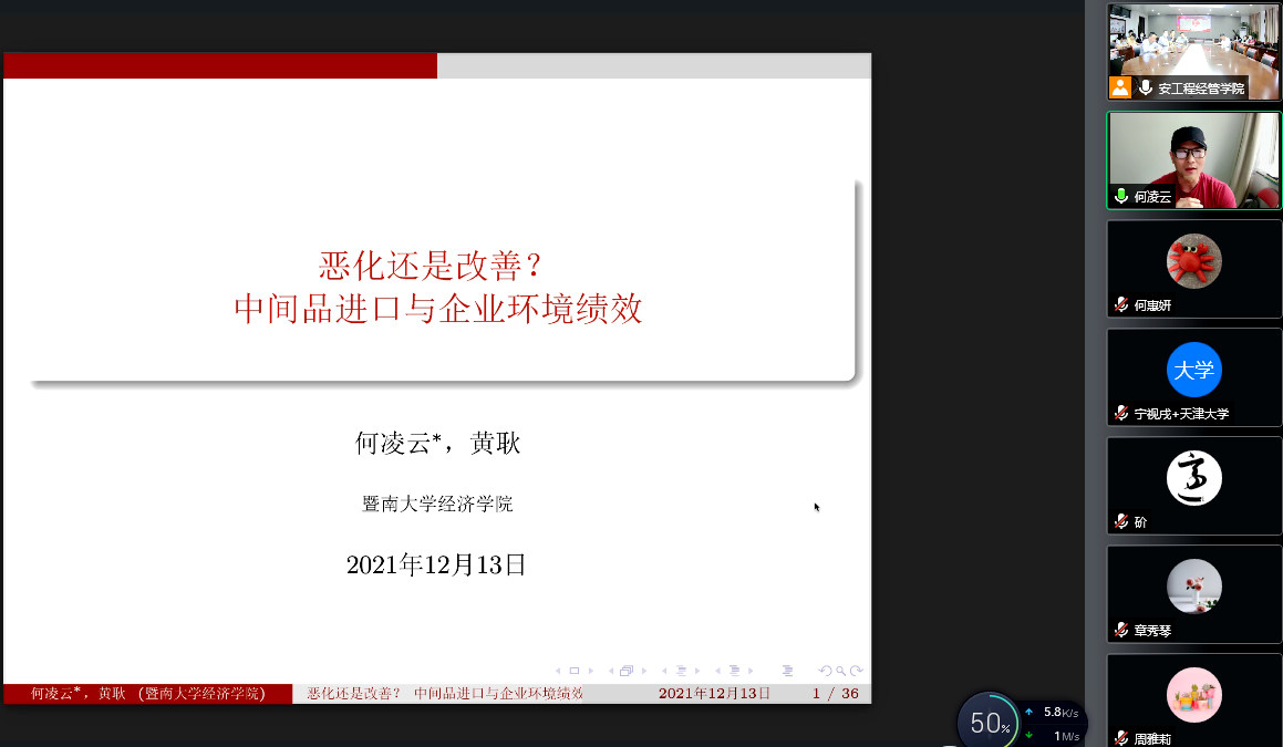 何凌云教授作了题为《恶化还是改善?中间品进口与企业环境绩效》的学术报告,报告中,何凌云首先从宏观层面分析了贸易与环境的国内外研究现状并提出了研究问题。接着,何教授构建了微观层面的贸易理论模型,分析了中间品进口和资本品进口对企业污染排放的影响,采用中国制造业企业的数据进行实证检验,说明了中间品和资本品的进口显著降低了企业的污染排放强度。此研究在分析中国的贸易利益时对考虑贸易环境效应和政府政策制定等方面具有十分重要的意义。