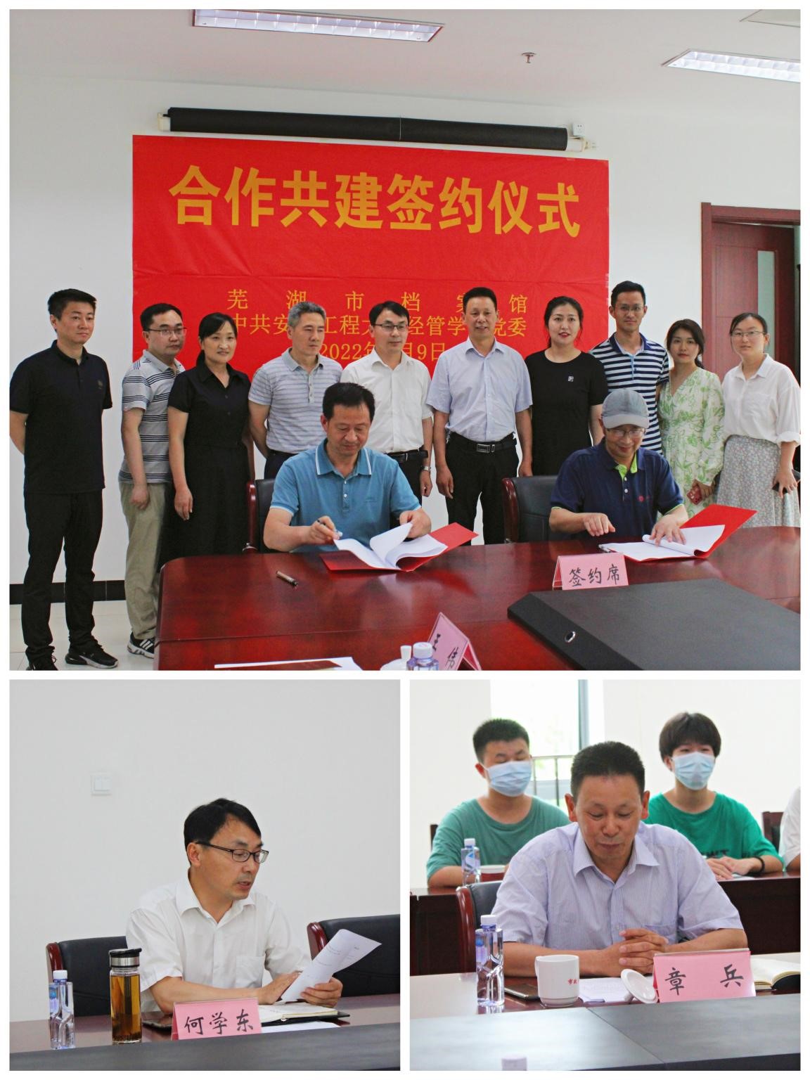 何学军介绍了芜湖市档案馆的发展情况,包括档案馆的基础设施、人员配置、编研服务、特色展览等几个方面,阐述了档案在红色教育中的独特作用,以及在促进大学生了解芜湖,推进芜湖紫云英计划中所发挥的独特作用。市档案馆认真贯彻习近平总书记对档案工作的重要批示,传承红色基因,用心用力服务党史学习教育,通过馆内资料展现芜湖历史印记与腾飞发展,激励00后大学毕业生扎根芜湖的意愿,为芜湖发展创造优异成绩,这与学院立德树人、教书育人的理念相得益彰,希望未来双方能进一步加强交流与合作。章兵就学院的基本情况及发展建设,党建、团建工作做了介绍与发言,希望共建双方通过“共学总书记讲话精神、共过组织生活、共强队伍建设、共享党建资源、共解群众急难、共推事业发展”等形式,推动基层党组织思想政治引领和理想信念教育能力进一步提升;通过开展校政产学研项目合作、课题研究,聚焦学科专业建设、教育教学工作、专业人才队伍培育引进,不断推动科学研究、产品开发、技术创新能力进一步提升;通过开展大学生就业创业、志愿服务项目合作,聚焦人才培养、毕业生就业、大学生实习实践和志愿服务活动,进一步提升人才培养质量、毕业生服务社会的能力,从而开启“共建互促、资源共享、优势互补、协调发展”的党建共建工作新局面。章兵对双方前期联合开展的“兰台印记”志愿服务活动、新生入学教育、党史学习教育等工作给予高度肯定,对市档案馆对学院的倾力支持表示感谢!在芜湖市档案馆的支持下,学院对青年大学生开展了芜湖市情教育和党史学习教育等主题活动,希望青年大学生通过芜湖档案馆的展览和资料了解芜湖,未来选择芜湖、留在芜湖、发展芜湖。双方表示将在党建学习交流、课题研究、社会实践、志愿服务等方面发挥双方资源优势,进一步扩大合作,党建、团建与地方发展深度融合,学校发展与芜湖市发展同频共振,创新开展党建、团建知识学习交流,深入学习党情党史,共同做好地方党建档案收集整理、开发和利用。促进双方党建团建与业务融合,创新开展主题党日、主题团日活动,助力红色档案搜集整理,开展形式多样的“党建+”、“团建+”学习交流研讨模式。