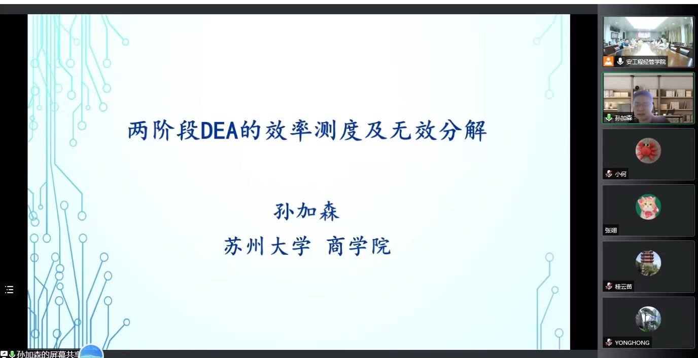 报告会上,孙加森教授作了题为《两阶段DEA的效率测度及无效分解》的学术报告。孙教授首先从DEA方法在银行、供应链、农业、交通等领域的应用出发,分析了单阶段DEA和两阶段DEA的不同,并以银行系统、循环经济系统和农村供应链金融系统为典型案例,详细阐述了改进的两阶段DEA模型和无效分解,为效率低下的商业银行绩效、循环经济系统效率调整以及农村金融机构效率提升等提出了改进针对性建议和改进途径。