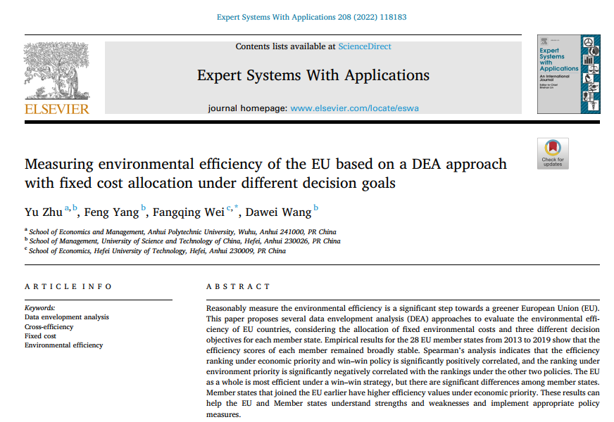近日,经济与管理学院教师朱钰作为第一作者(RayBetApp官网下载 为第一单位)与中国科学技术大学杨锋教授、合肥工业大学魏方庆副教授以及中国科学技术大学博士生王大伟在《Expert Systems with Applications》在线发表了题为“Measuring environmental efficiency of the EU based on a DEA approach with fixed cost allocation under different decision goals”的学术论文。Expert Systems With Applications是国际权威期刊,中科院大类一区,JCR一区,IF 8.665。