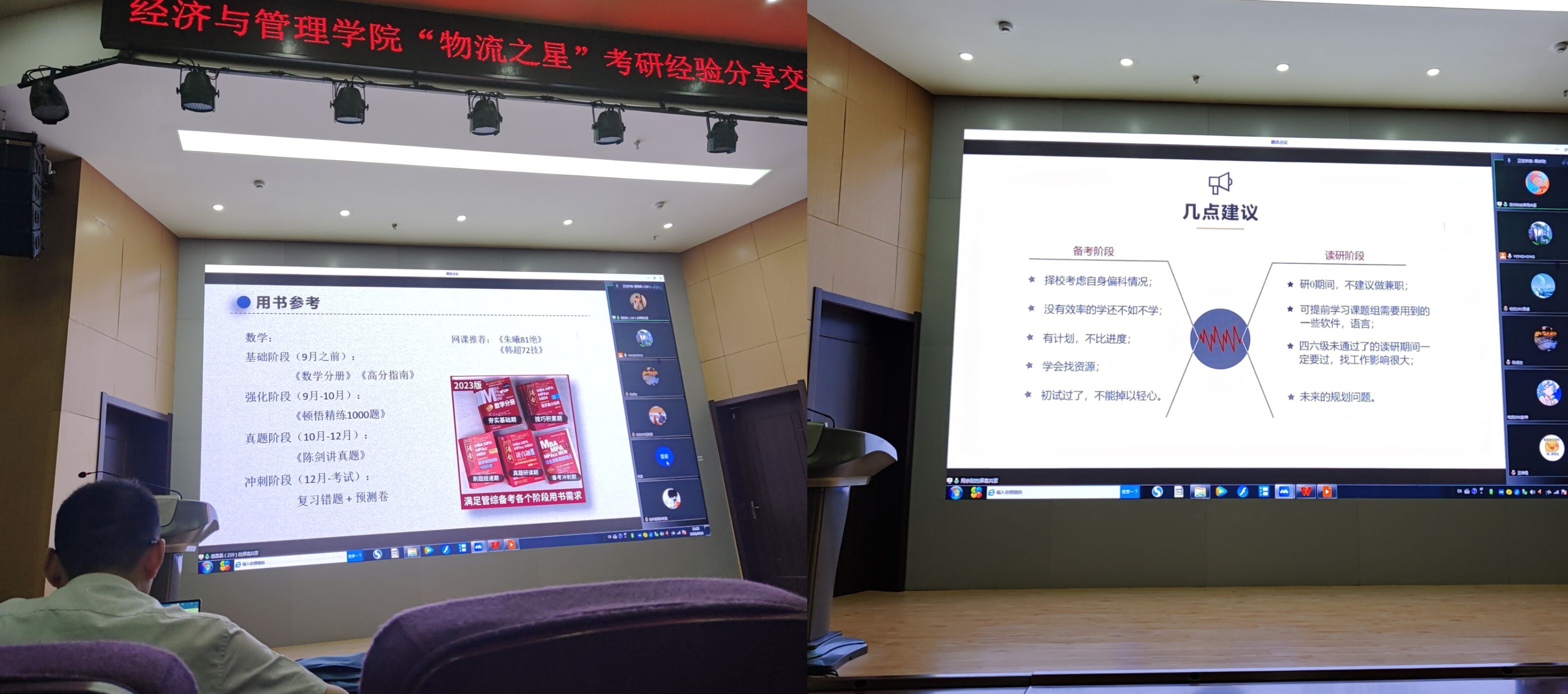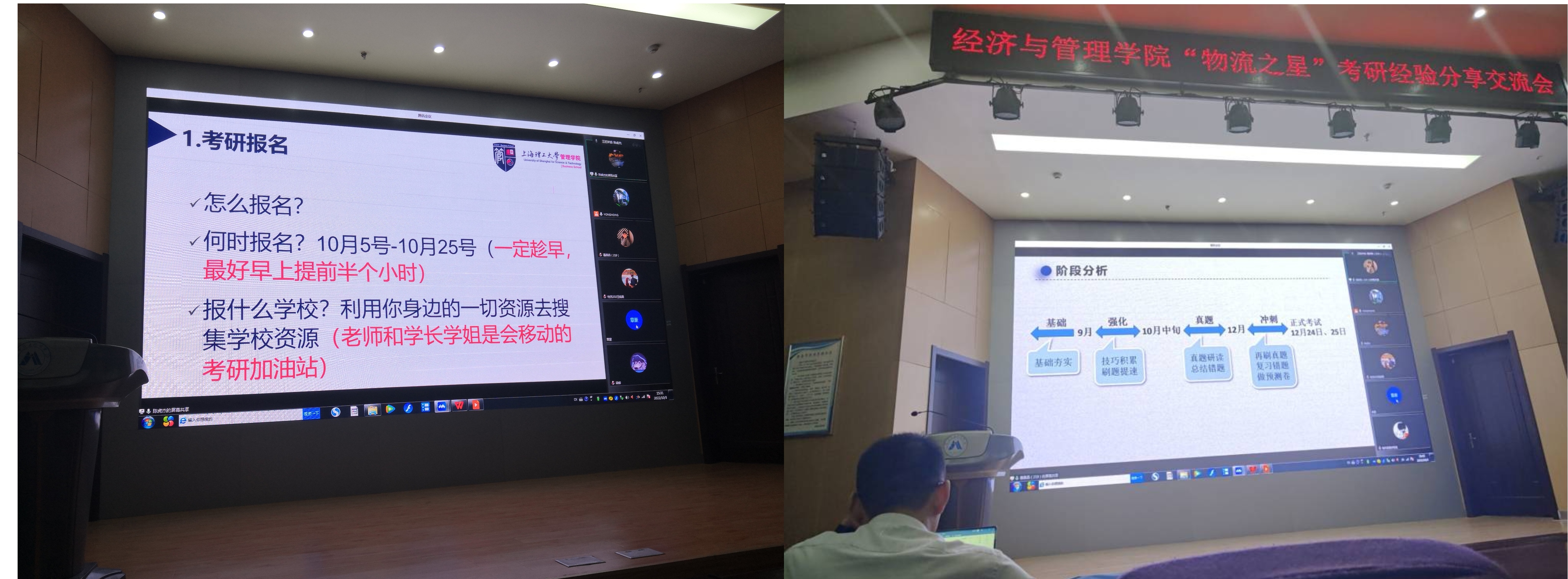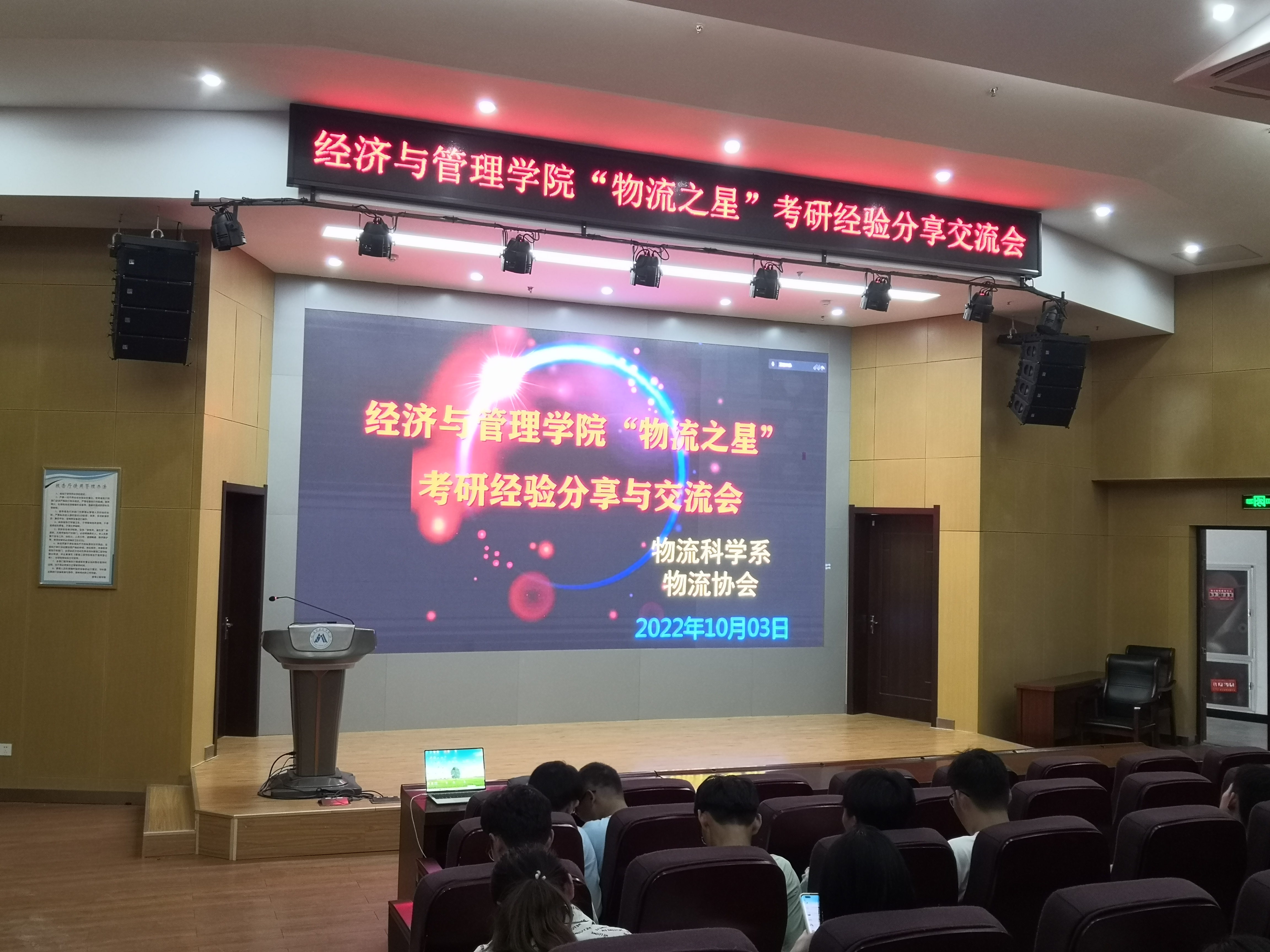 为深入贯彻落实学校“三全六专”育人工作通知精神,加强学风建设,让学生“学”起来。10月3日下午,经济与管理学院物流科学系在C座7楼报告厅,通过线上线下相结合的方式举办了“物流之星”考研经验分享交流会,物流管理专业四个年级200多位同学线上线下参加了分享会。