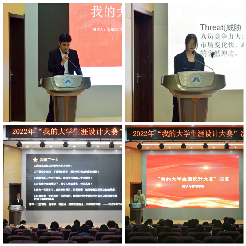 为了认真落实学校党委“三全六专”育人工作要求,让学生“正”起来、“学”起来、“壮”起来、 “乐”起来、 “勤”起来、 “和”起来,增强大学生的自我认知能力,提高学习效率,培养社会主义核心价值观,经济与管理学院于10月22日下午在C座7楼报告厅举办了“我的大学生涯设计大赛”决赛。