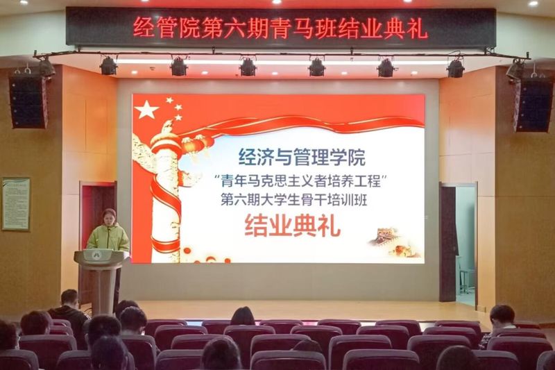 为坚持用习近平新时代中国特色社会主义思想武装青年学生干部头脑,认真贯彻落实习近平总书记关于青年工作的重要思想,让青年学子“正”起来,为党培养和输送坚定的青年政治骨干,10月26日,经济与管理学院第六期“青年马克思主义者培养工程”大学生骨干培训班结业典礼在C座7楼报告厅隆重举行,院团委书记赵恒梅,本期培训班班主任吴兆克以及全体青马班学员参加典礼。