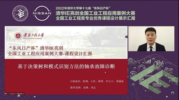 2022年10月29-30日,第十七届“东风日产杯”清华IE亮剑全国工业工程应用案例大赛在清华大学主会场成功举行。由我校经济与管理学院吴锋和刘志两位老师指导的张翊、杨倩、王浩、田文丰和葛丽茹五名同学组成的团队,以“基于决策树和模式识别方法的轴承故障诊断”案例参赛,从全国众多高校参赛队伍中脱颖而出获得优秀等级,并在清华IE亮剑全国工业工程应用案例大赛中荣获全国一等奖。此外,操雅琴老师指导的江新莲、雷蕾、徐涛、龙爽和柳晓婷提交的“救灾机器人远程操作控制台”案例,沈超老师指导的王岩岩、韦慧杰、赵银文、宋琦和路骏驰提交的“轴承故障诊断”案例均获得良好等级。本次成绩刷新了我校参与清华IE亮剑赛事和工业工程类专业优秀课程设计展示活动以来的最好成绩。