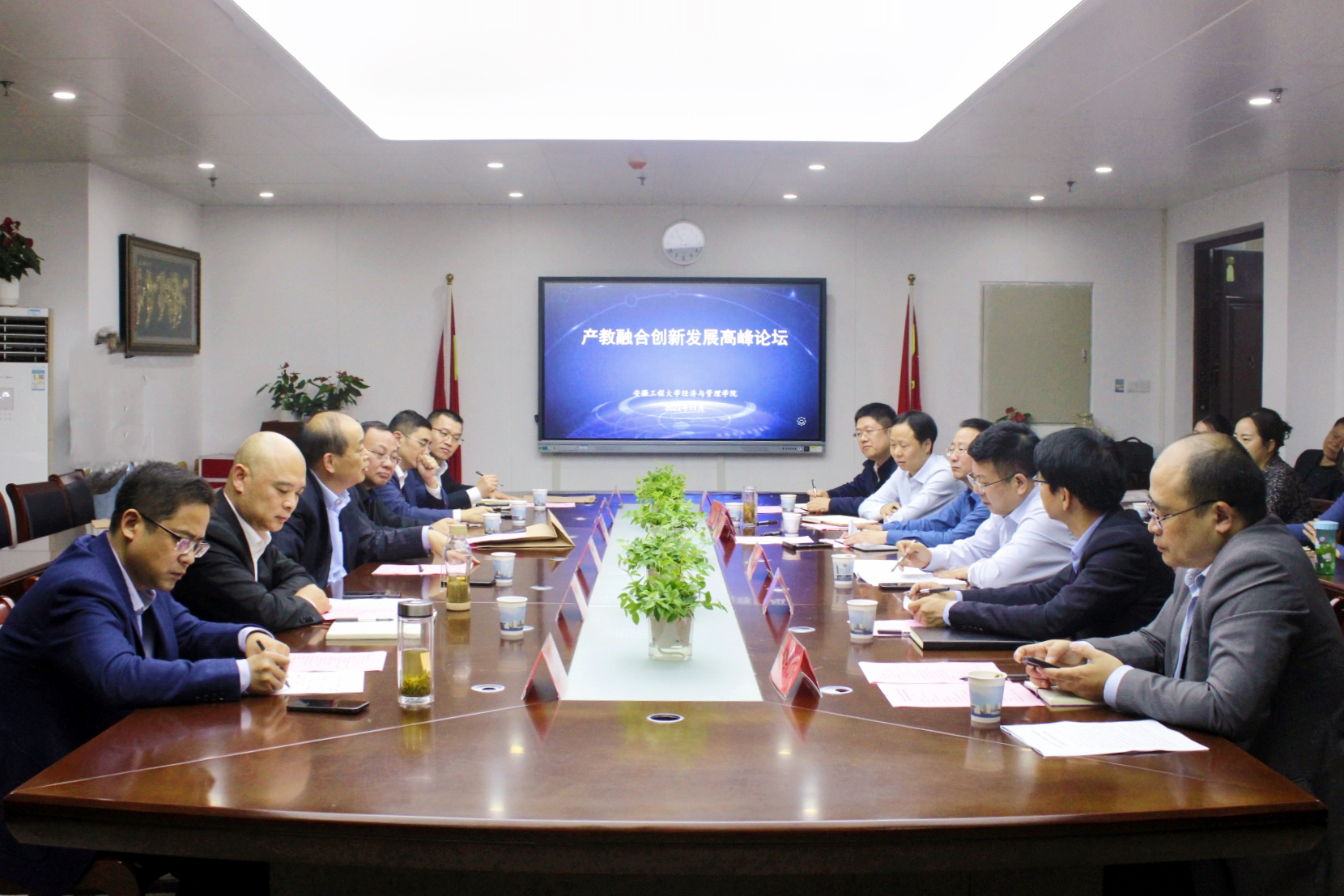 芜湖市人才集团党委书记、董事长杨少华作了题为“深入实施紫云英人才计划 奋力打造区域人才中心和创新高地”的政策分享报告。他从人才引领、政策护航、智赢未来三个方面介绍了“紫云英人才计划”的创新成果,全力实现人才与城市的双向奔赴。在交流研讨环节,李康、宋志刚、卢立新、郑兆瑞、张海滨和黄红宏等产业教授激情发言,为产教融合创新发展建言献策,初步谋划“校企学徒制”、打造“产教研博士团队”、建设“区块链实训室”等产教融合措施,为进一步推进我校产教融合贡献智慧和力量。
