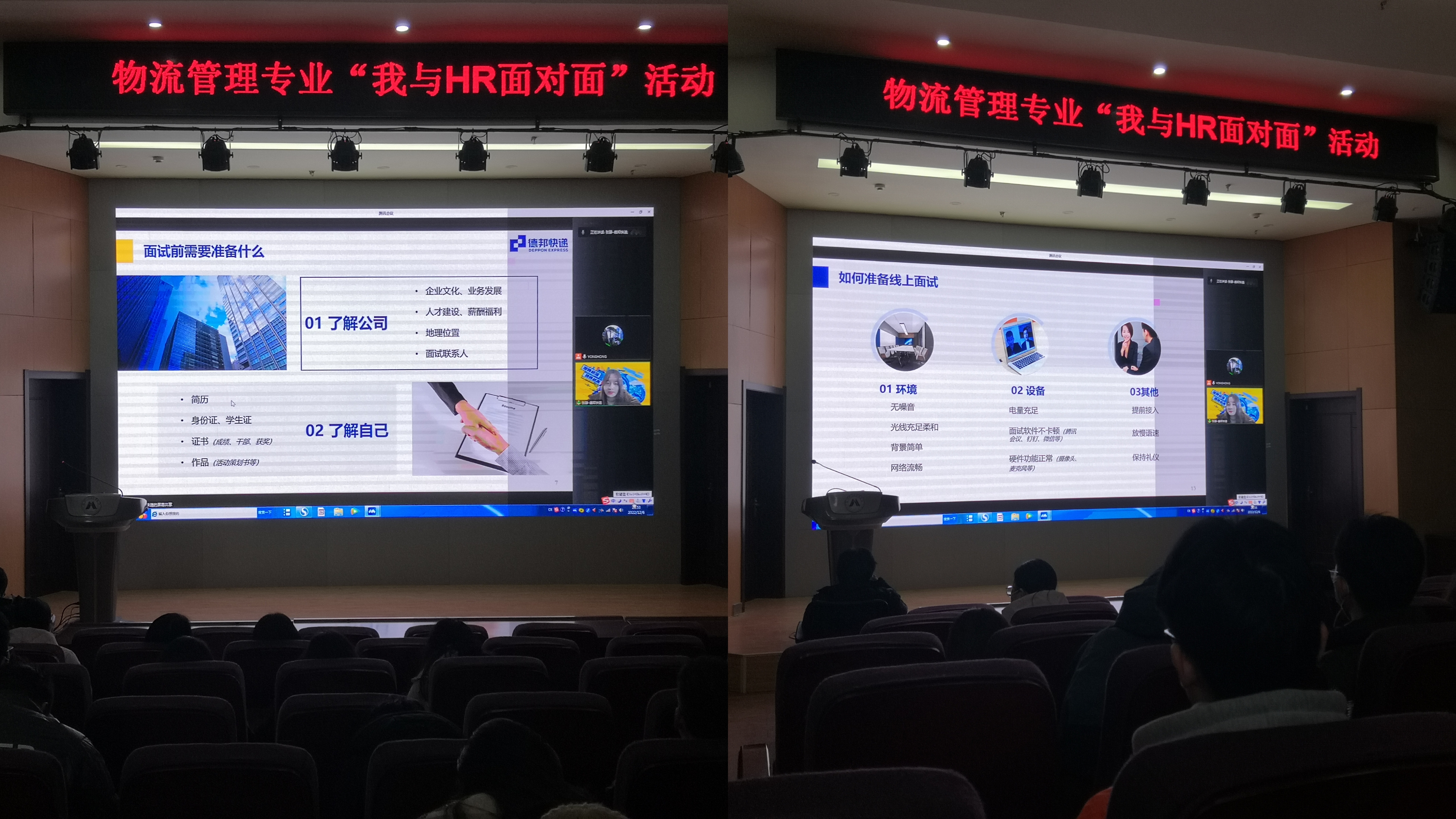 为进一步帮助大四和大三学子树立正确的就业和择业观,了解物流行业以及供应链管理岗位的就业形势,提高个人综合素质以及确立个人的发展方向,扎实做好高年级学生的就业指导服务。12月6日,经济与管理学院邀请了纬湃汽车电子(芜湖)有限公司的资深HR王珍女士和德邦快递(上海)股份有限公司的资深HR张静女士,在C座7楼报告厅为学生们做作了《应聘与面试》专题报告,物流管理专业2019级和2020级近100名学生现场聆听,报告会通过线上线下结合方式进行。