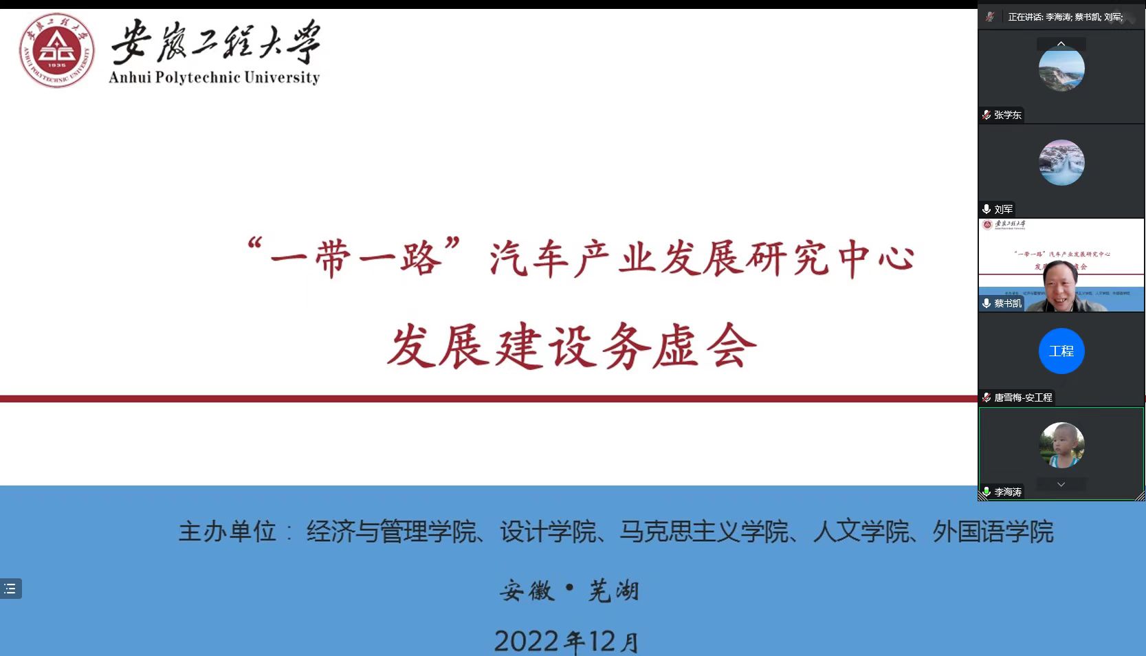 12月22日上午, “一带一路”汽车产业发展研究中心发展建设务虚会召开。人文学院院长刘军、设计学院常务副院长张学东、外国语学院副院长唐雪梅、马克思主义学院副院长李海涛通过线上方式参加了会议。