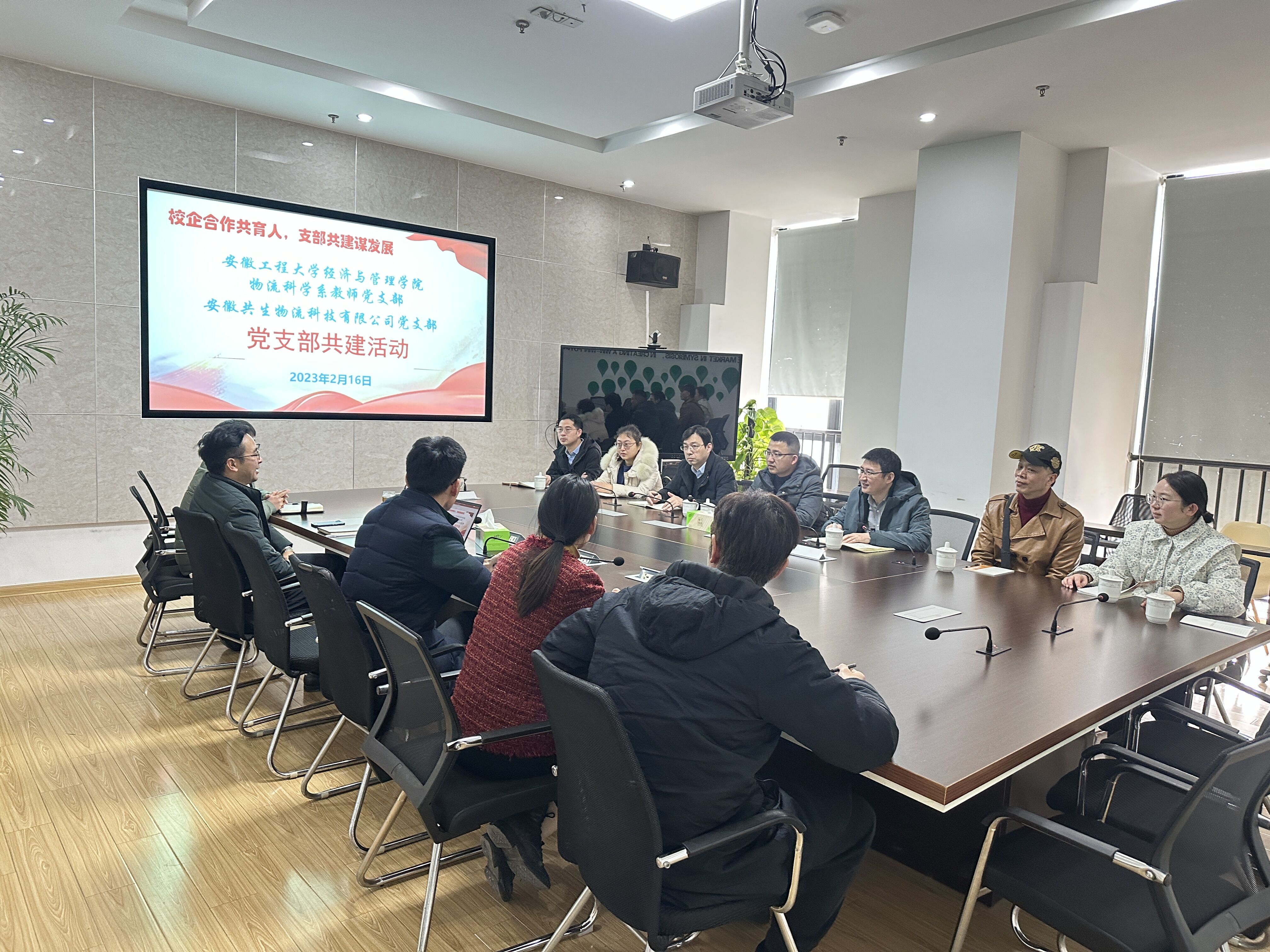为深入学习贯彻党的二十大精神,落实学校党委“三抓”工作部署,积极推进校企合作交流,提升物流管理国家一流专业的人才培养质量,探索高校与企业党支部建设新模式,实现优势互补,合作共赢。2月16日,经济与管理学院物流科学系教师党支部和安徽共生物流科技有限公司党支部(下称“共生物流”),在共生物流公司总部开展了“校企合作共育人,支部共建谋发展”为主题的支部共建活动。共生物流公司总裁、党支部书记刘春生,物流科学系主任、教师党支部书记程永宏、以及两个党支部的党员参加活动。