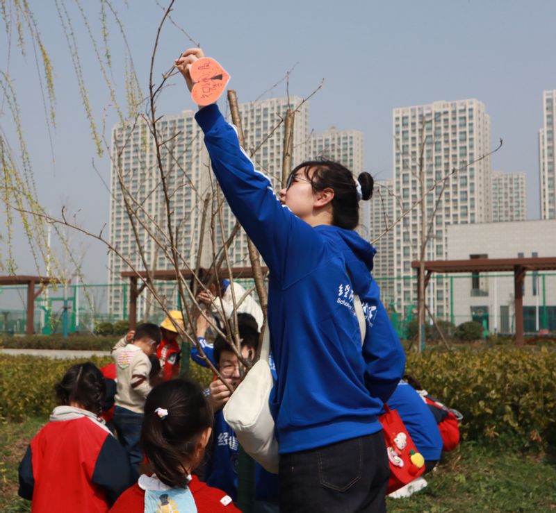 活动伊始,举行了“植初心,树未来”签名仪式,青马班学员和春水湾幼儿园的老师在桁架上签下自己的名字并合影留念。活动第二项,青马班学员向春水湾幼儿园30名小朋友讲述绘本植树节的由来,让现场的小朋友深入了解到植树节的重大意义。活动第三项,在青马班学员的带领下,让幼儿园的小朋友们找寻在他们眼中春天的模样,行走在春日里,感受春天带来的生机。活动第四项,青马班学员与春水湾幼儿园的小朋友们一起带着铁锹、水桶等工具,三人为组,共同植树培土。植树现场在一片片欢声笑语中,为一棵棵绿色的希望松土,浇水让它们茁壮成长。为三月的国际工程师学院增添了一份色彩。活动最后,悬挂心愿卡,青马班学员帮助小朋友们在他们的浇水松土的树木上悬挂上他们的心愿卡,一张张心愿卡在春日里,接受风的吹拂,同时春日暖阳也照耀了在场师生及小朋友的身上。